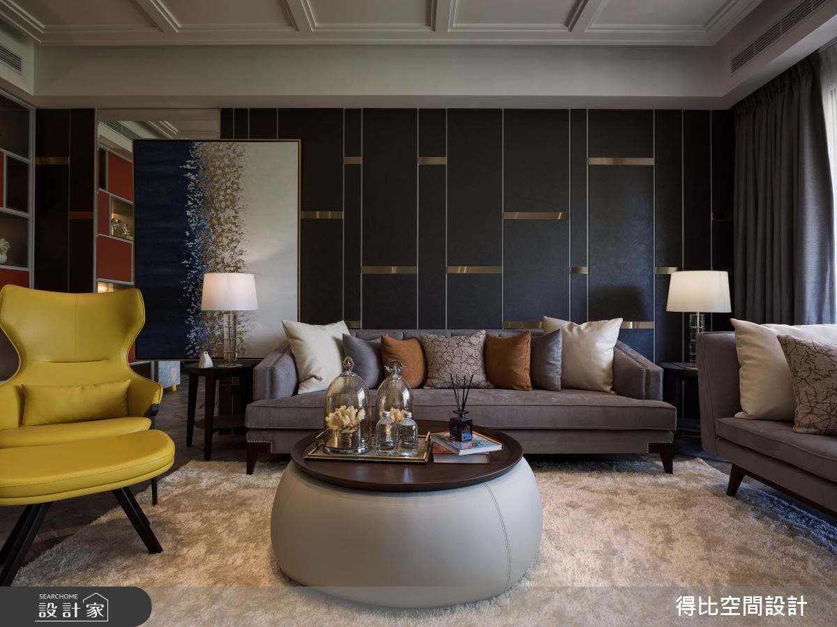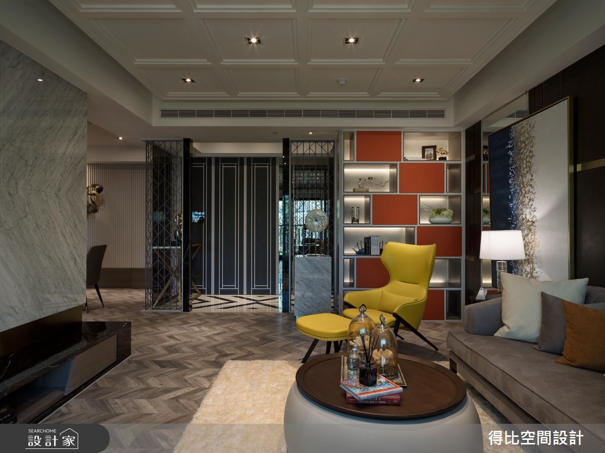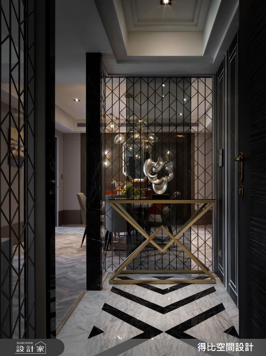 玄關大量採用三角幾何元素,像是黑白對比的地坪、金色藝品展示台、雷射切割鐵件屏風,一入門就感受到獨特的奢華氣質,並隱約指引通往室內的動線。客廳透過格狀天花拉開序幕,沙發背牆鋪設灰藍特殊板材,佐以直向木作噴漆與橫向鍍鈦金屬,與請畫家專門繪製的三色掛畫相互輝映,達到一種不對稱的分割美感。