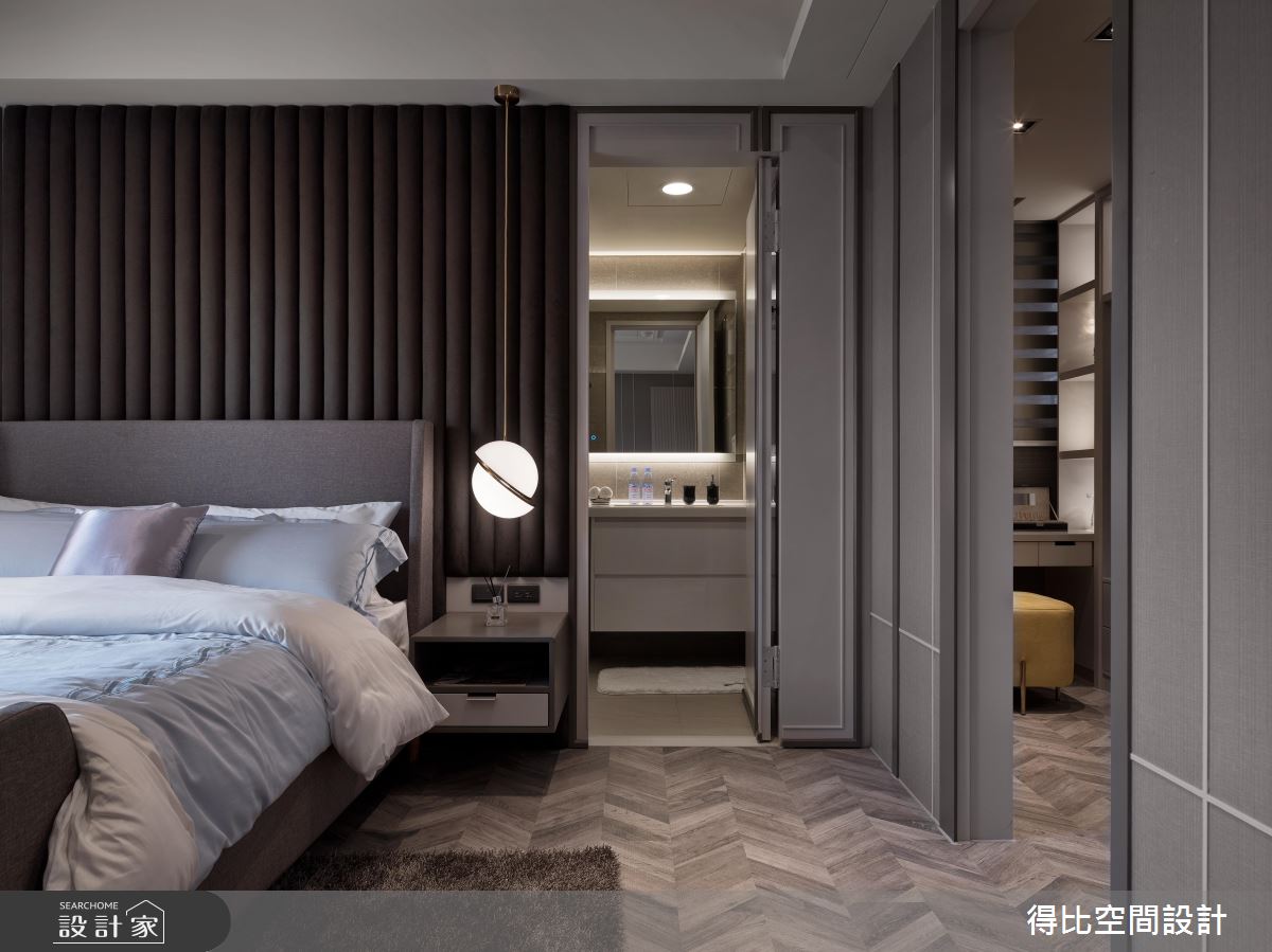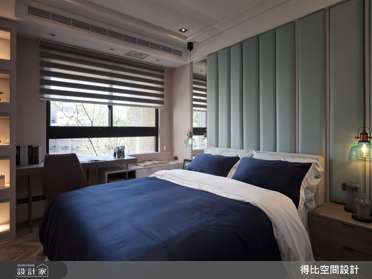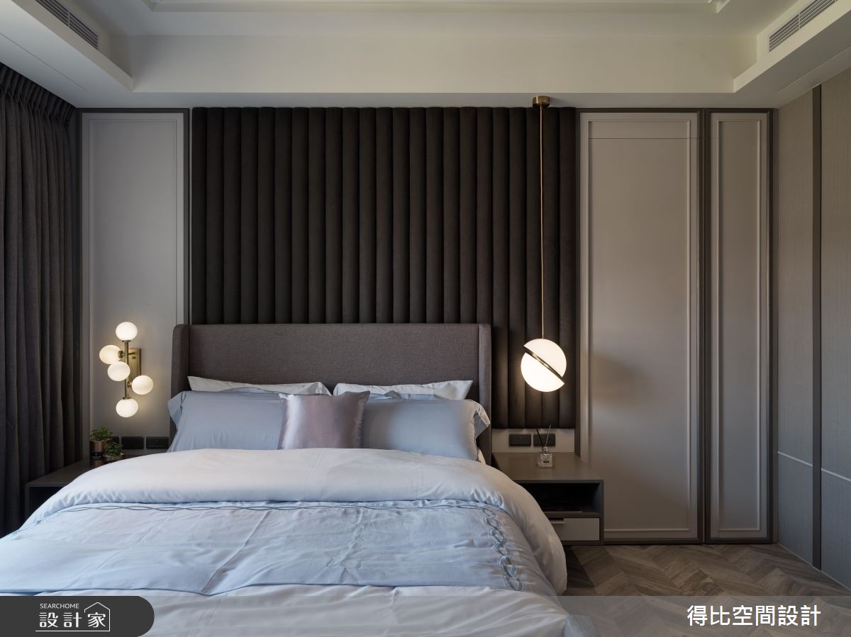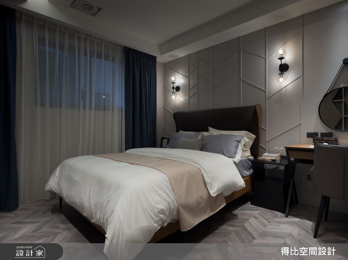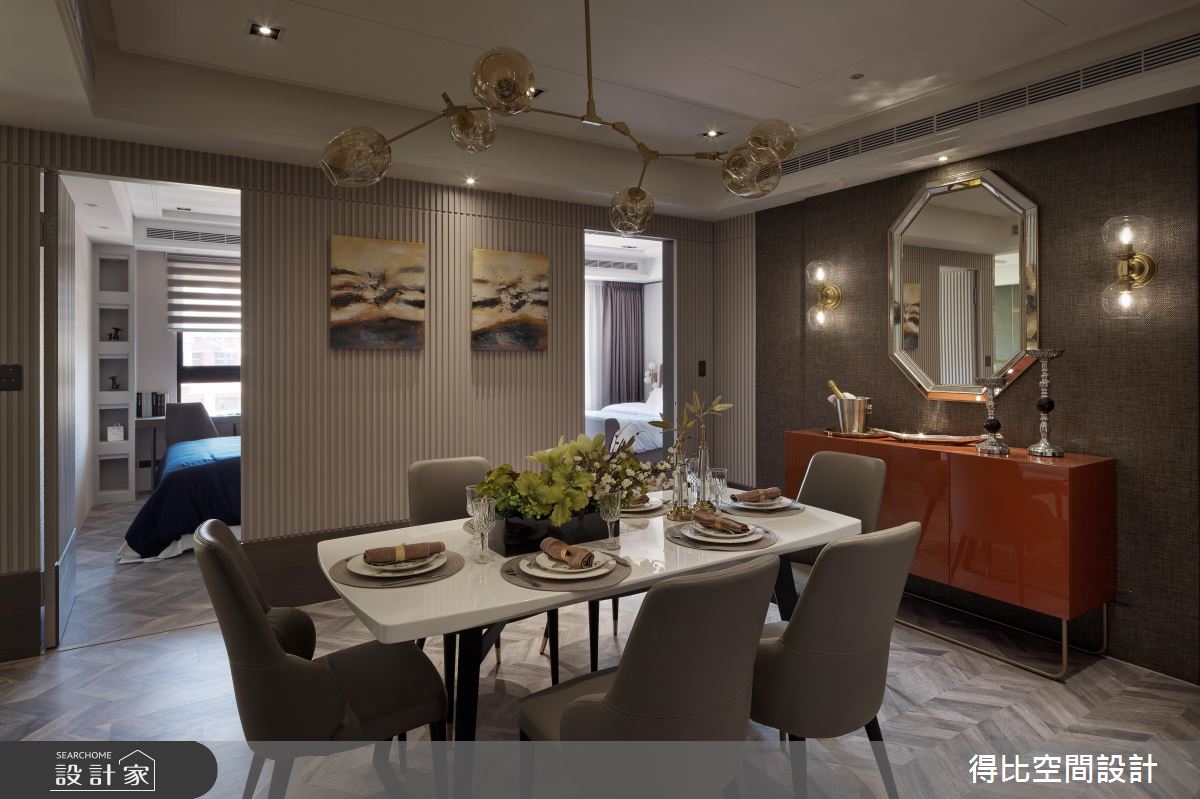 餐廳三面牆隱藏了三間臥房、客浴與廚房入口,主牆妝點多用於地板的深咖啡編織毯,展現設計師不斷嘗試的實驗精神與源源不絕的創意,材質時尚又便於清潔,而格柵壁板造型下方的木皮踢腳板,則刻意拉高讓空間擁有高挑感。主臥藉由隱藏門片的線板、金屬燈具,貫通不對稱的設計美學,繃布的線條切割則放大床頭視覺。另外,由於女兒常飛國外,因此設計師在湖水綠臥房的窗邊,設置書桌與矮櫃結合的平台,方便她攤開行李箱做整理,同時創造高低差的豐富視覺。
