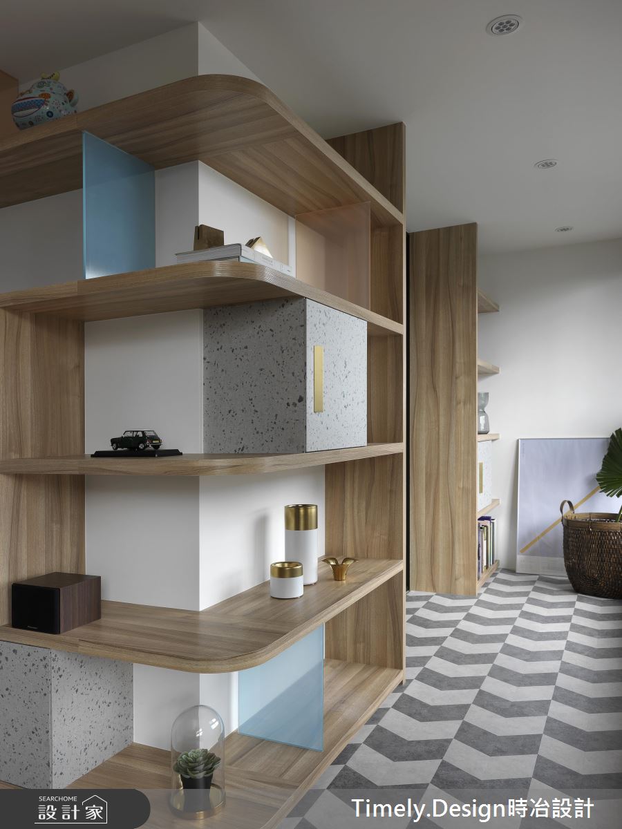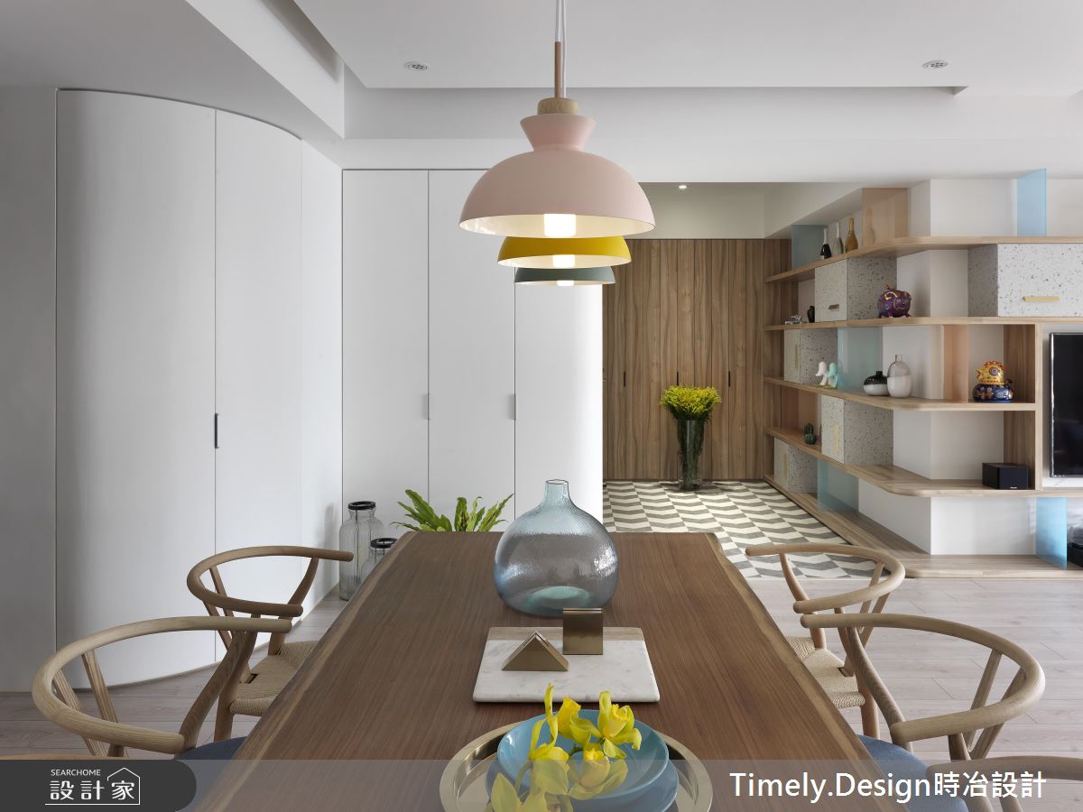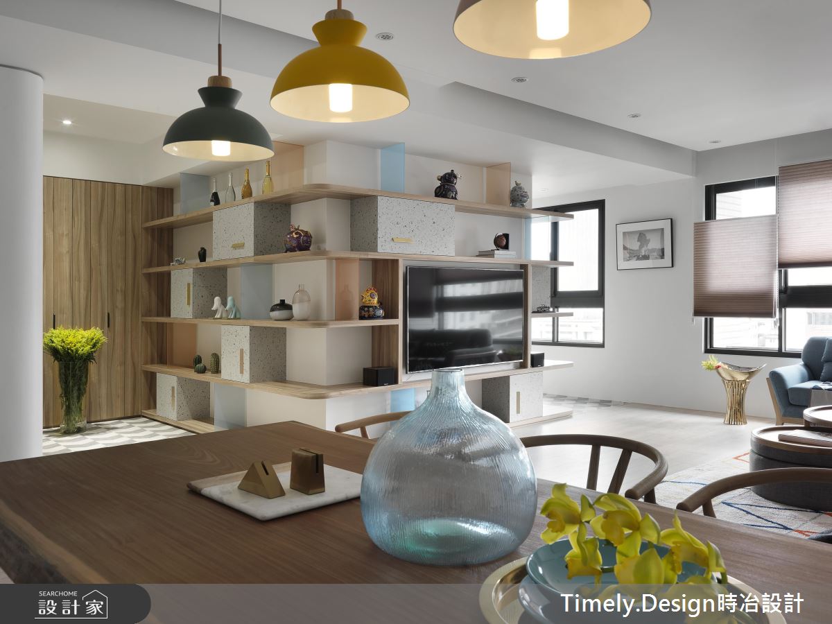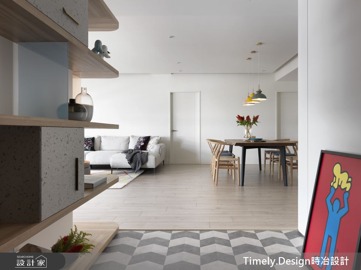 踏入玄關處,深淺灰階的造型磚界定場域,隱藏式的櫃體各以淨白、木質從兩邊開展,兼具美感與收納機能;彩色玻璃、淺灰櫃體打造開放式的環型書架,複合電視牆的機能,通透、繽紛卻不失穩重;透氣窗簾則在巧妙地佈局下,展現層次不一的細膩光譜,映照在造形簡約的木作餐桌,搭配古樸藤椅,為團聚時刻增添一絲悠然快意。