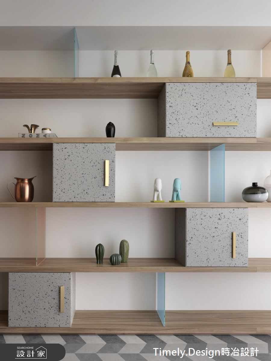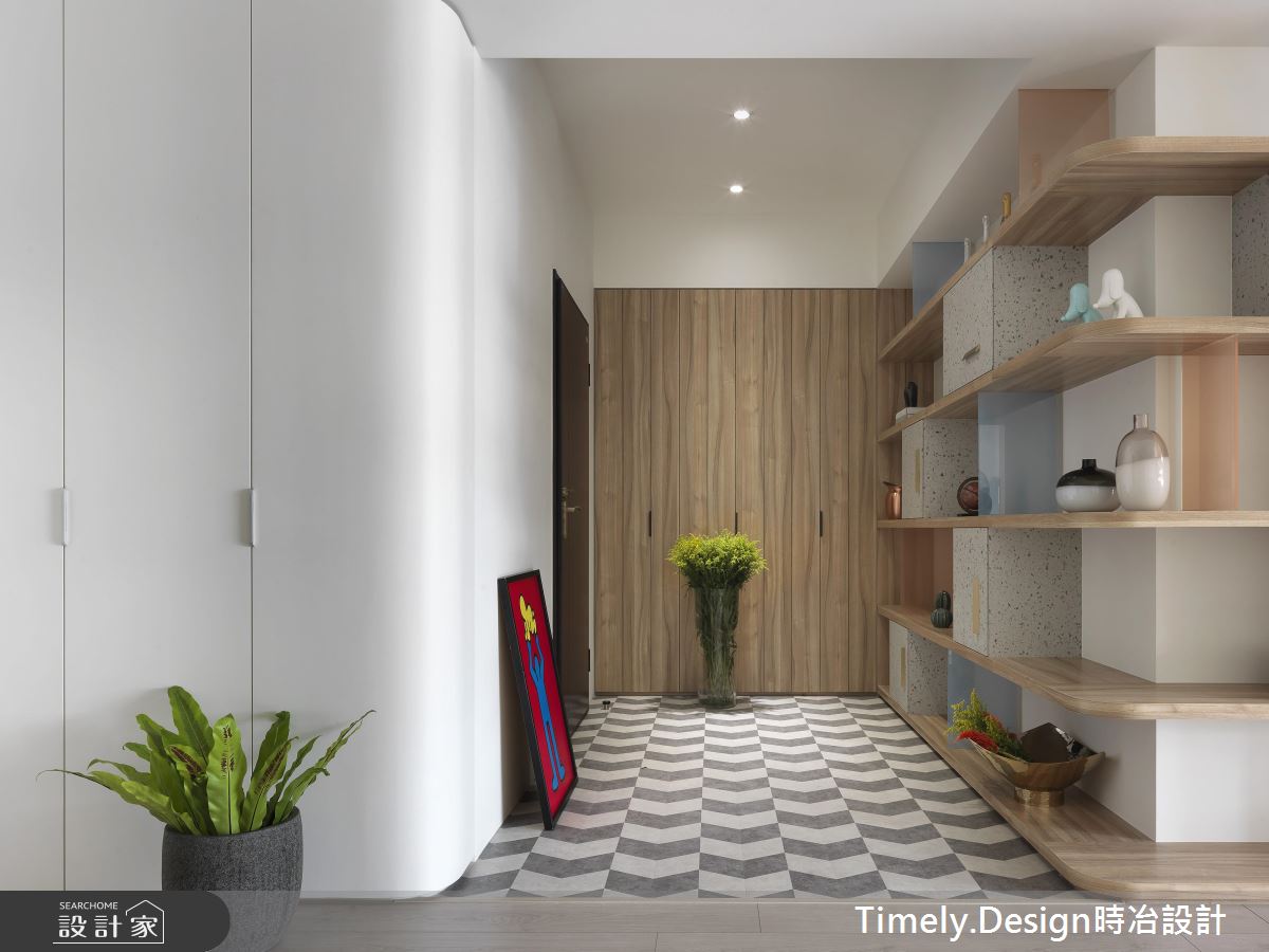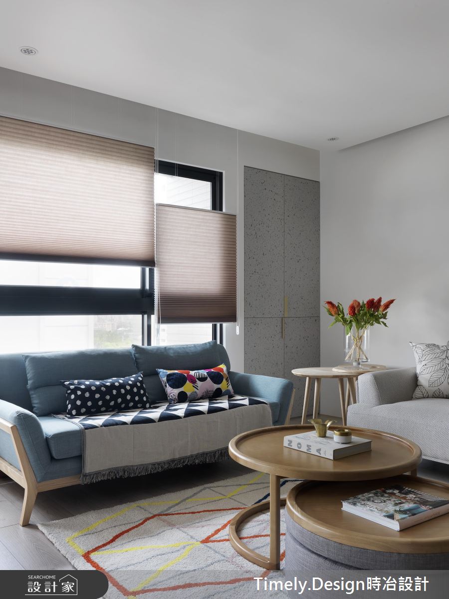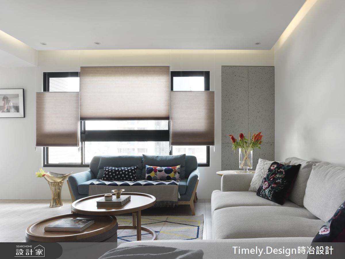 踏入玄關處,深淺灰階的造型磚界定場域,隱藏式的櫃體各以淨白、木質從兩邊開展,兼具美感與收納機能;彩色玻璃、淺灰櫃體打造開放式的環型書架,複合電視牆的機能,通透、繽紛卻不失穩重;透氣窗簾則在巧妙地佈局下,展現層次不一的細膩光譜,映照在造形簡約的木作餐桌,搭配古樸藤椅,為團聚時刻增添一絲悠然快意。