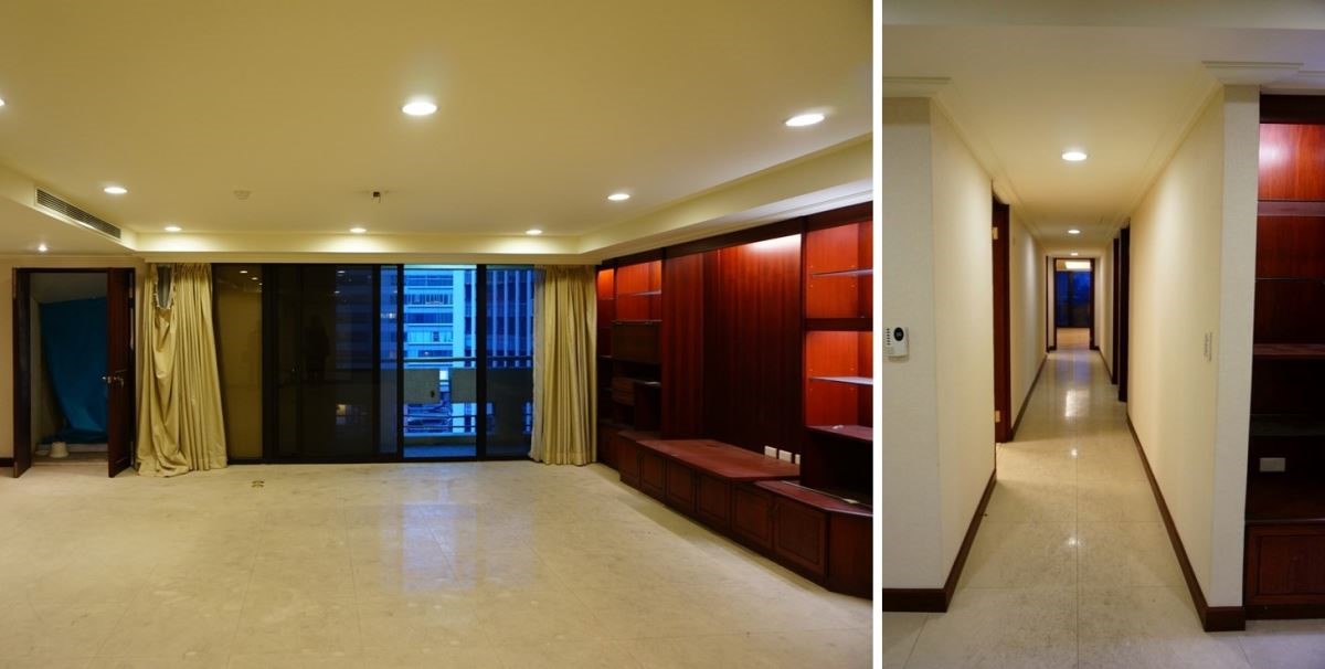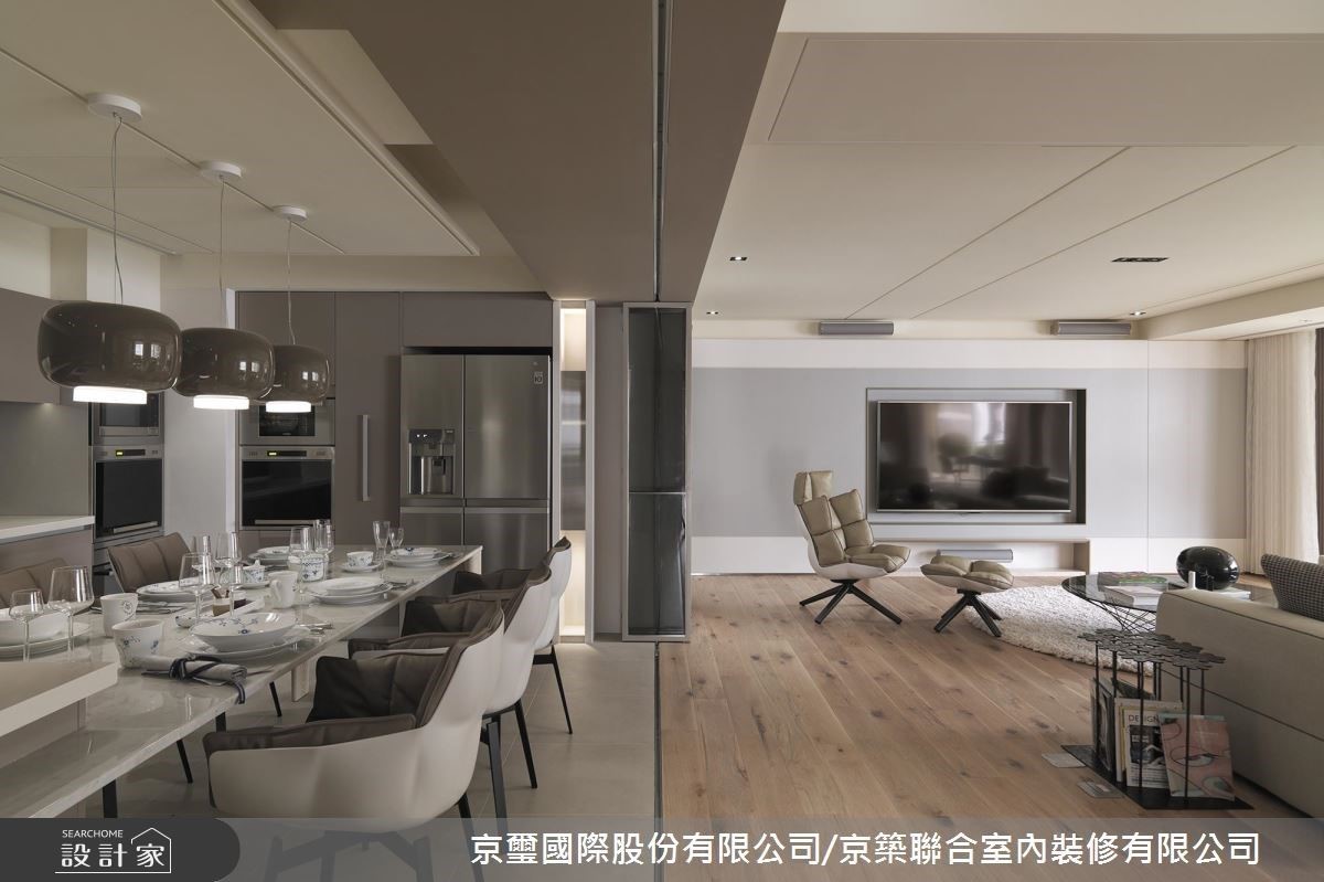 原本五房的格局形成一條仿如宿舍,兩側都是房門的幽暗廊道,過多的零碎規劃,也不符合年輕屋主對享受生活的簡單追求。周總監重新梳理動線,僅保留主臥與兩間客房,方便家人來台居住或朋友留宿,其他兩房則擴充為公領域,讓寬敞的客廳開放串聯起琴房與增大的餐廚區。周總監更為經常競標紅酒的屋主,在廚房規劃了 3 坪大的智能化酒窖,讓他不必在外應酬,也能在自家私廚與三五好友共度愉快的微醺時光。