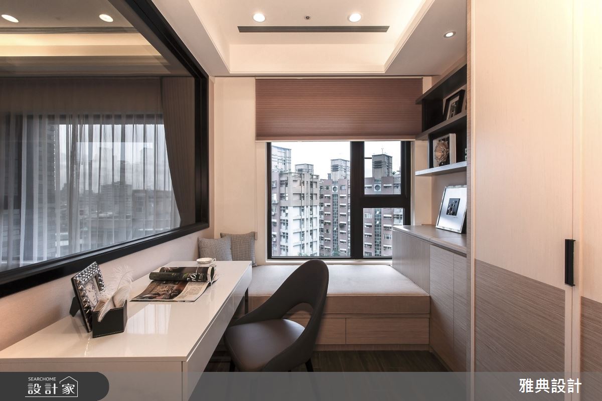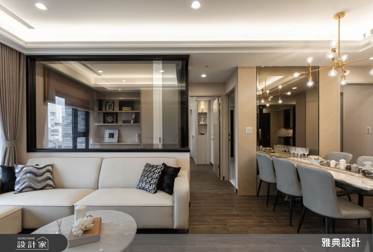 沙發後方以半高玻璃牆打造書房空間,穿透特性的材質界定下,將公領域的視線納入眼簾,打破領域界定;臨窗臥榻區的安排,增添慵懶的愜意氣息,且提供短暫的休憩時光。