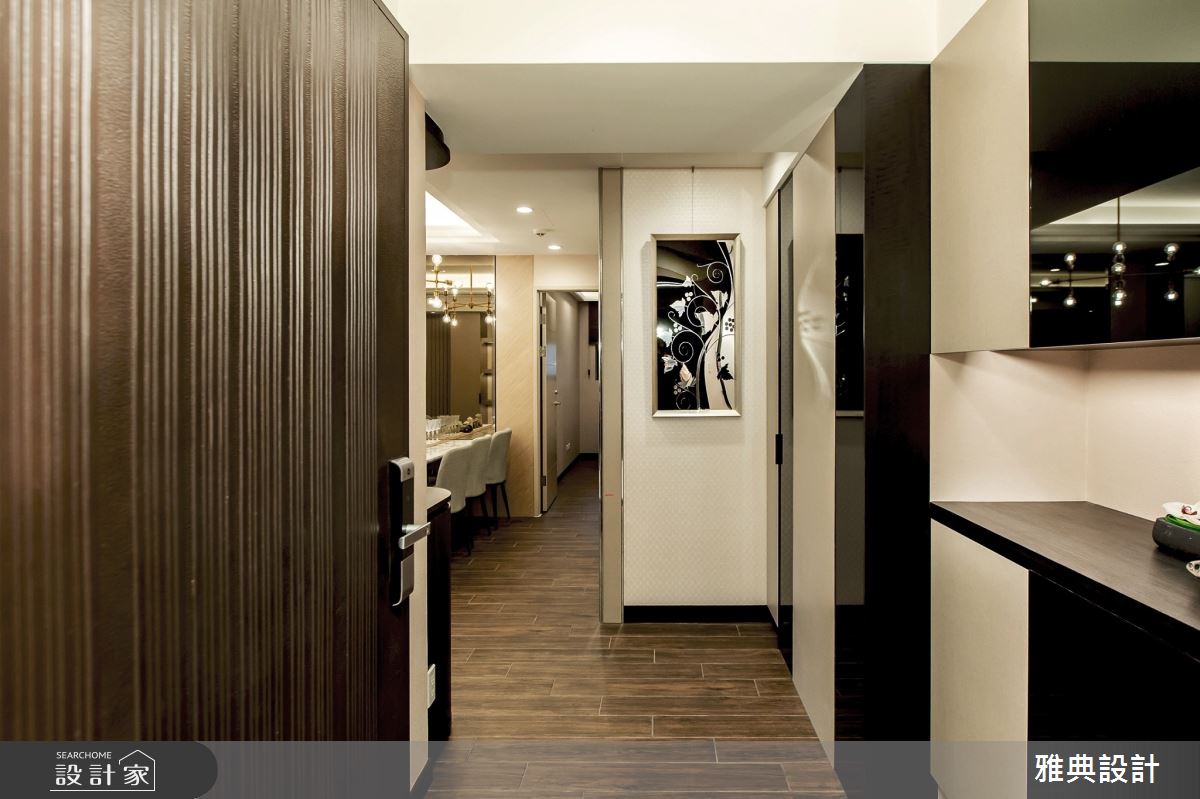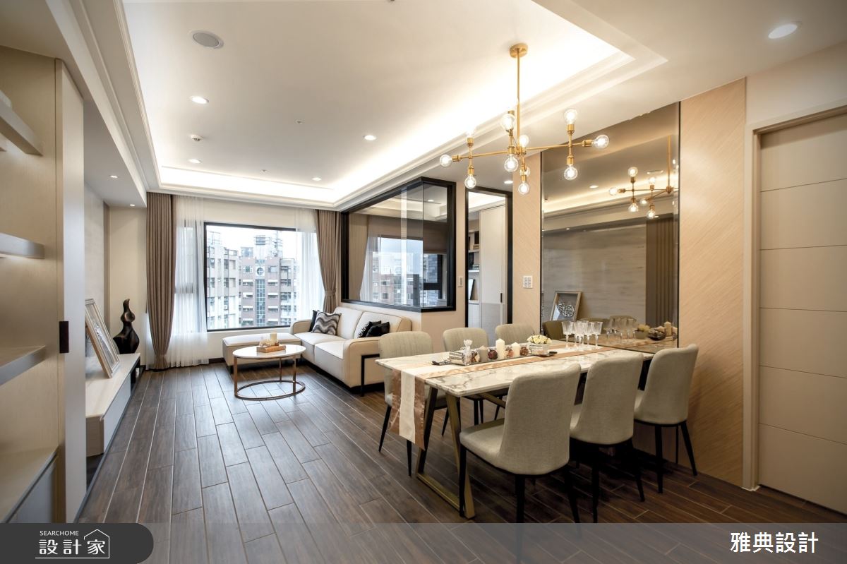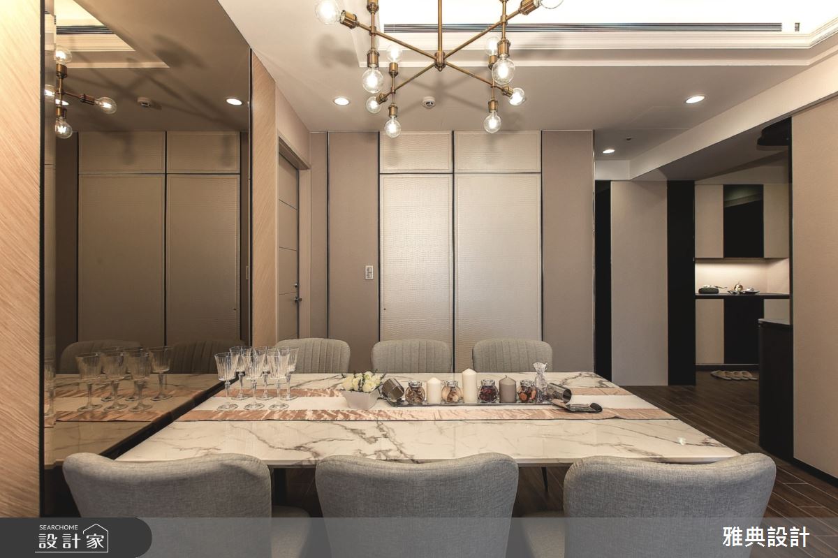 推開大門,迎向一面樑住下形塑的畸零空間,牆面掛上一幅精緻質感的黑白畫作,自然的元素與設計語彙,洋溢著動人的藝術美感,成為絕佳的迎賓丰采。公領域裡,引入戶外充沛暖陽,木紋肌裡鋪敘地坪、牆面刷上柔和的奶茶色,構築滿室溫潤質感;白色大理石打造電視牆,透過些微紋理的妝點,挹注一抹輕柔淡雅之美,兩側以條紋立面點綴,彰顯對稱之意;牆面左側創造一面展示陳列區,間接光線灑落在層板上的藝術品或風格物件,展現動人的精緻光芒;以展示櫃為軸線,連結到餐廳區,壁面貼附的茶鏡巧妙映照出展示櫃的美學精彩,且搭配一盞結構式燈泡吊燈,替用餐空間更添一抹精緻流光。