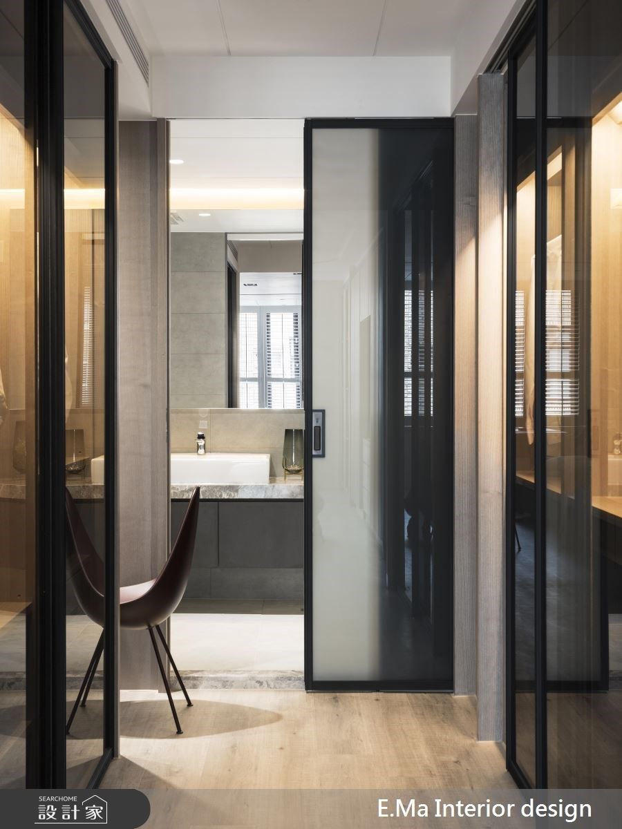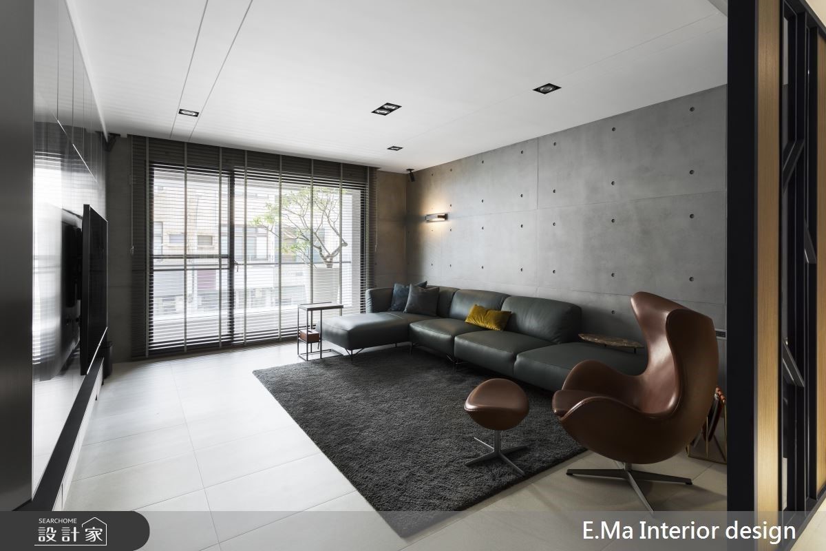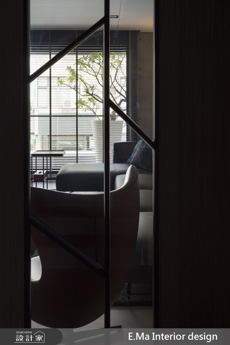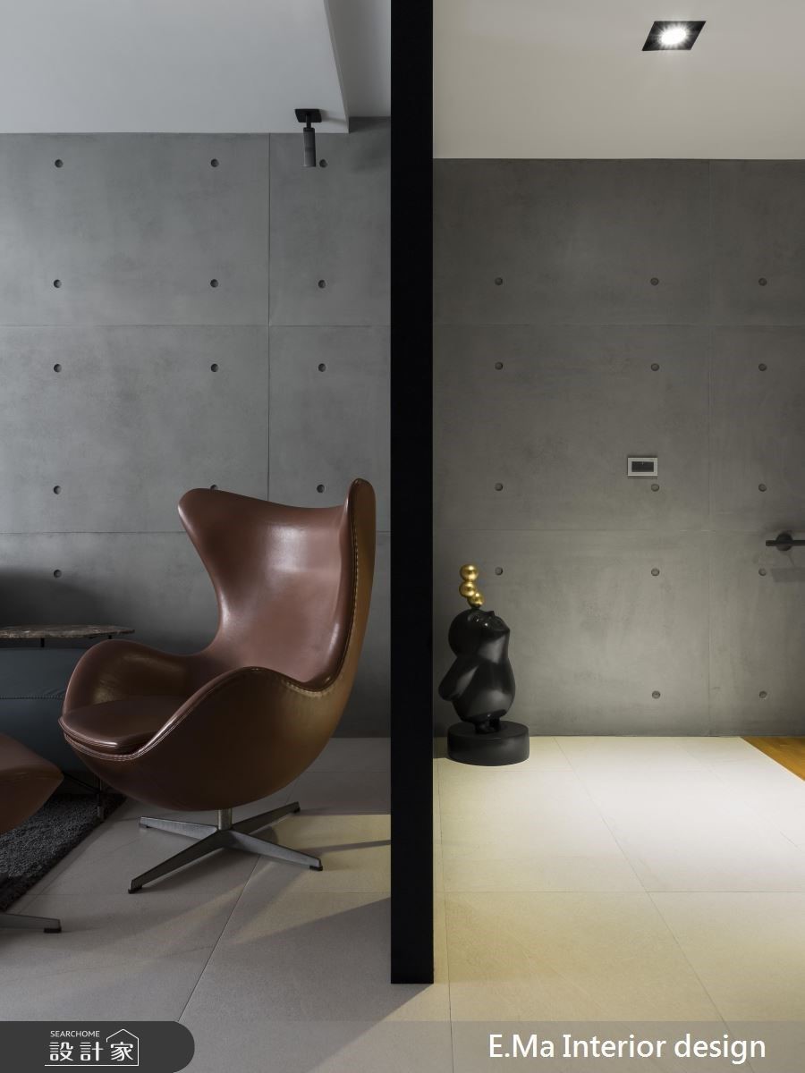 拾級而上,進入二樓玄關,將建築外觀的清水模延伸入內,鋪陳清簡有味的大器場域。並透過玻璃隔屏結合黑鐵的切割線條,讓對向落地窗光穿梭無礙,營塑若隱若現的空間情境,而兩邊嵌合鋼刷木皮,以溫潤質感再化解客廳的灰階冷調。