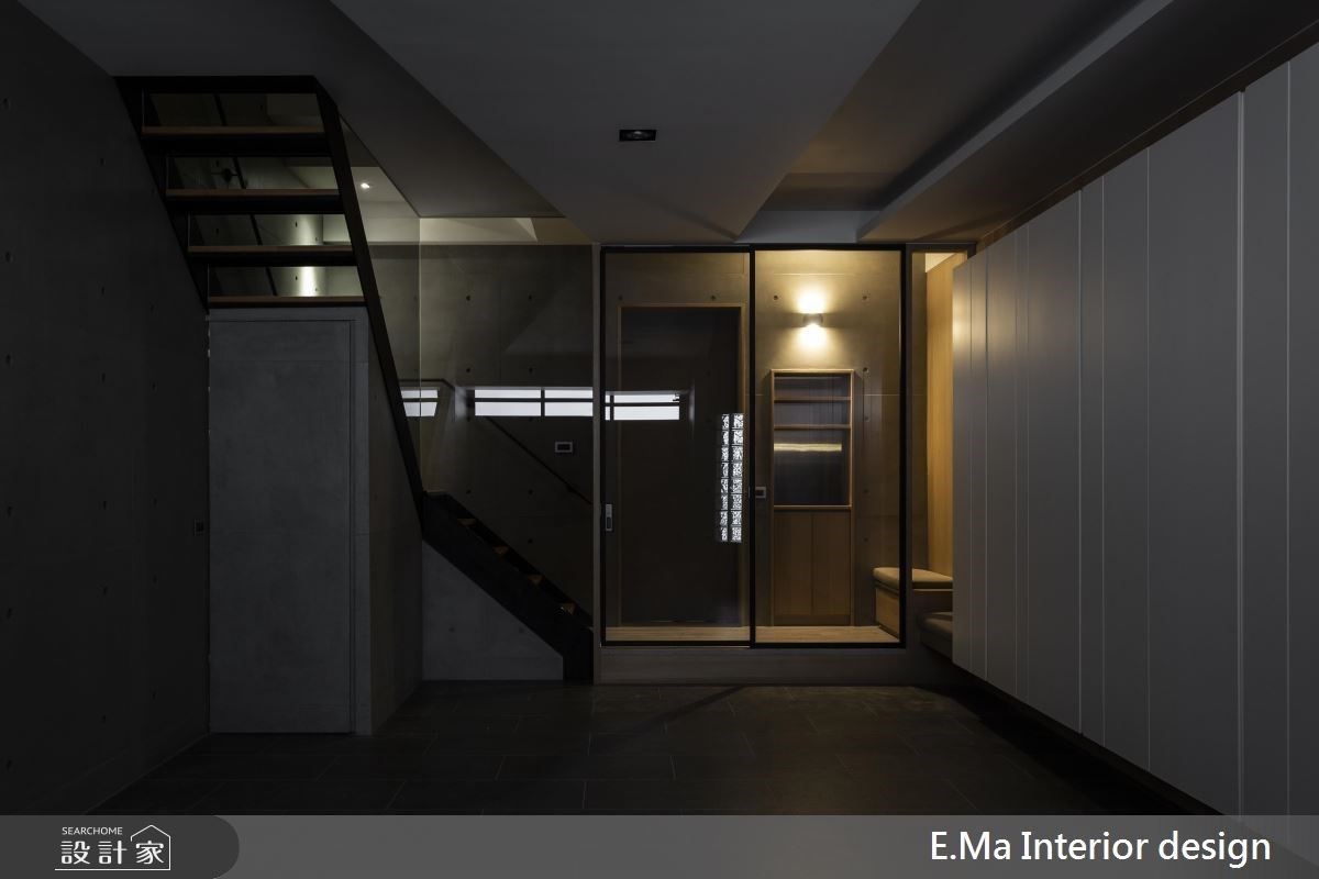 即使從車庫走進家,也要醞釀氣氛。將地板架高,以玻璃為拉門,把小小的梯間,透過燈光營造如曲徑;壁面則以不銹鋼嵌玻璃,微露景深,挹注神祕感,並賦予收納和穿鞋椅的機能;加寬的鋼構梯面則結合玻璃扶牆,視覺通透又安全無虞。