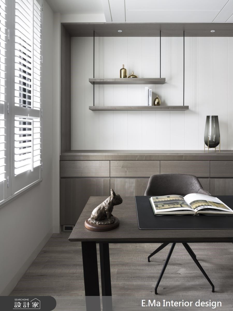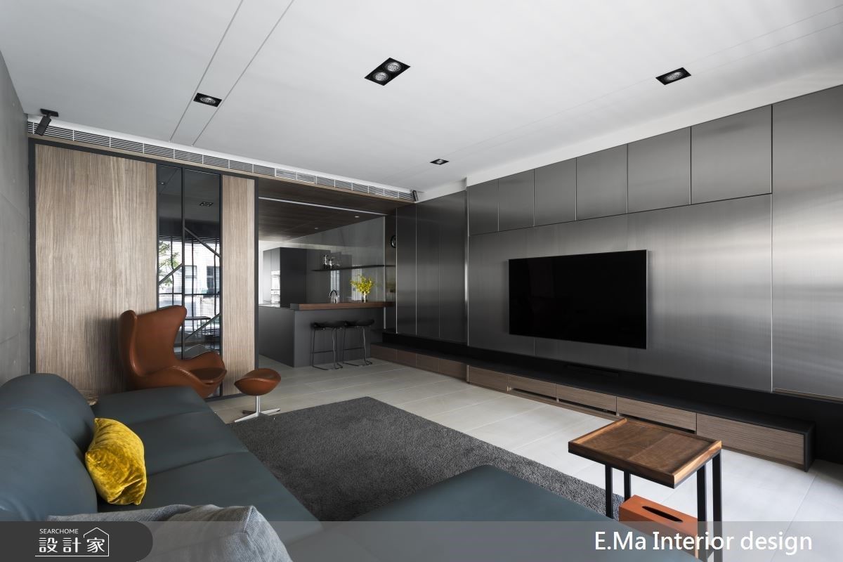 呼應屋主的職業屬性,電視牆大膽鋪陳不銹鋼材質,挹注冷冽的剛性性格,加以簡潔的切割線,更加形塑進退有序的俐落感,同時於上方隱匿收納機能,下方則懸空微露黑鐵介面,再呼應隔屏的鋼刷木,契入長條型的電器櫃,添暖木質紋理。