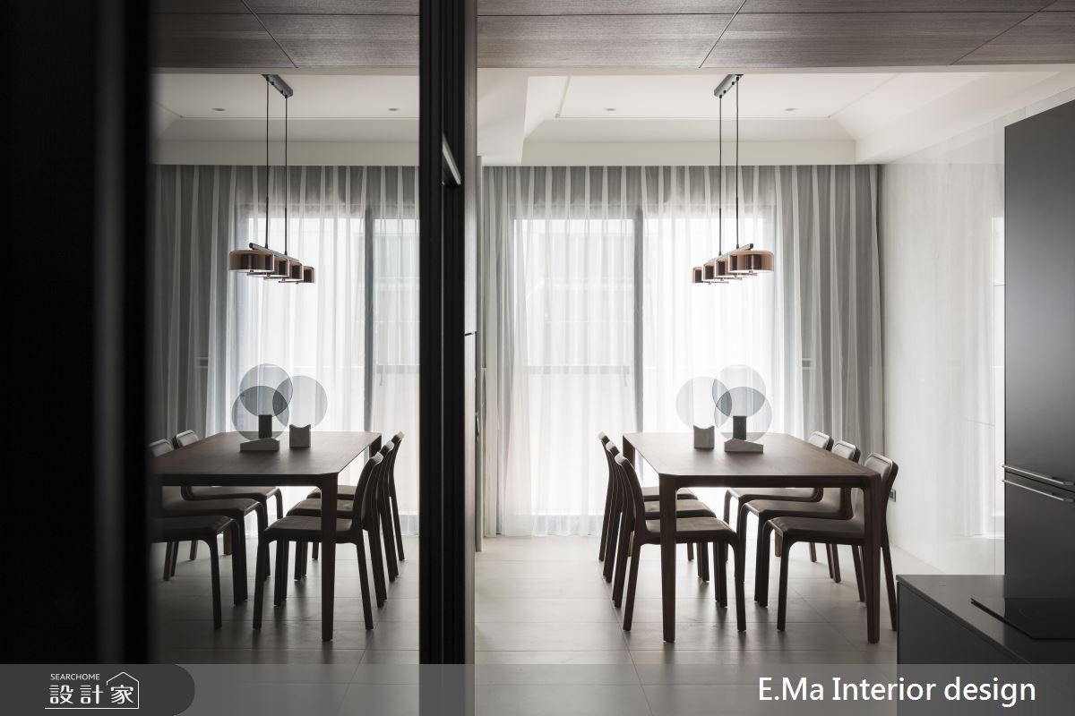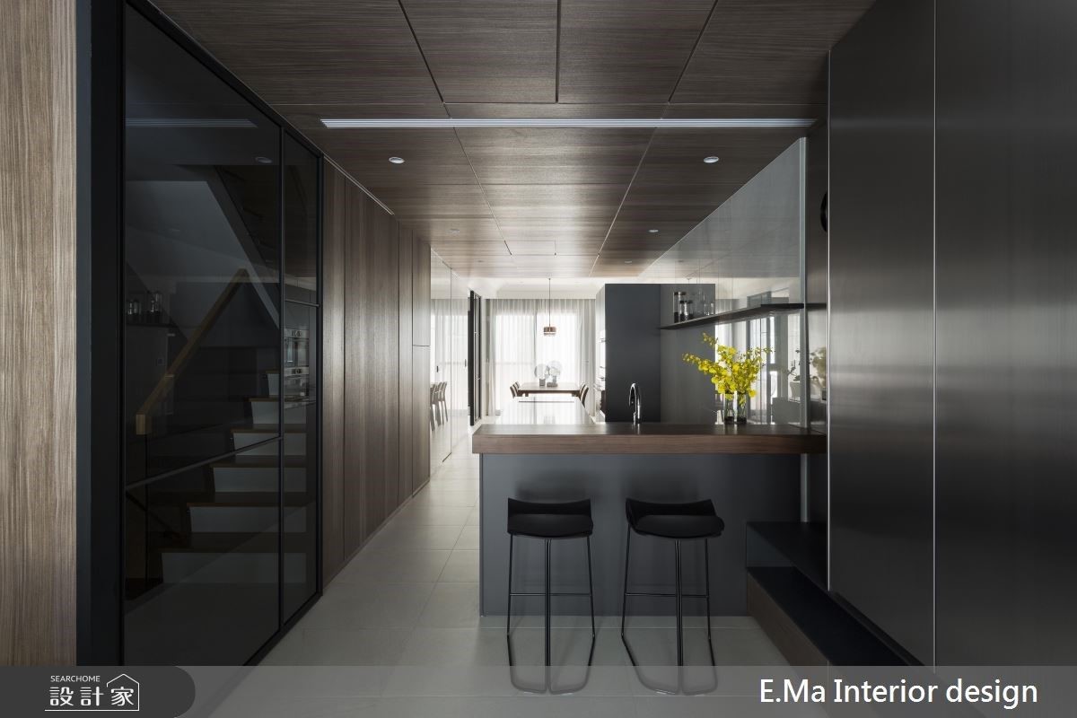 順沿電視牆的線性律動,導引進入中島餐區;大量的木質紋理從牆鋪到天花,形塑別有洞天的美味空間,以滿滿的溫馨平衡剛冷的客廳。而一般引為主角的白色石材,此時則以配角低調登場,以溫潤的君子調性接續電視牆之後,襯托鋼材的霸氣演出。