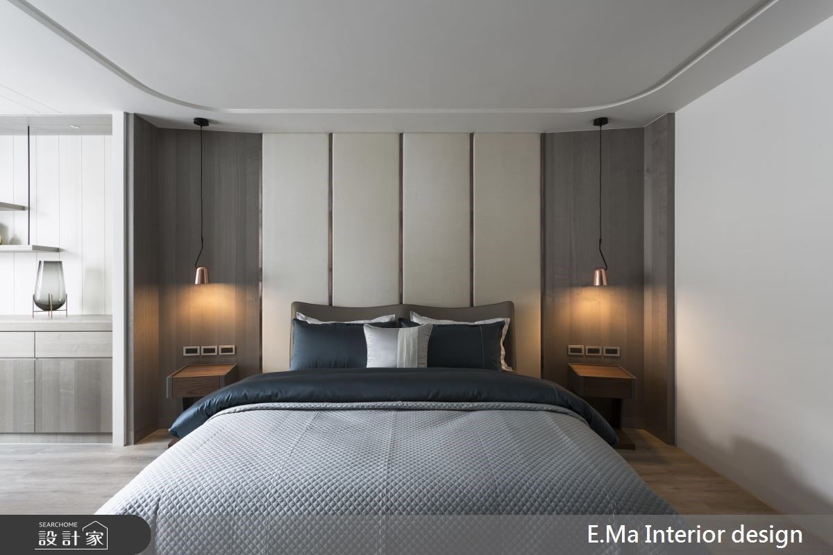 三樓主臥以繃布為床頭,搭佐微轉折的木質牆,懸以吊燈,形塑微屏隔的好眠空間,並據此分界閱讀區,於樑下加木作「框」,結合腰櫃和造型層架,完美修飾樑柱。更衣室則以玻璃拉門為衣物防塵,形塑如精品櫃,且形之於過道通往衛浴。