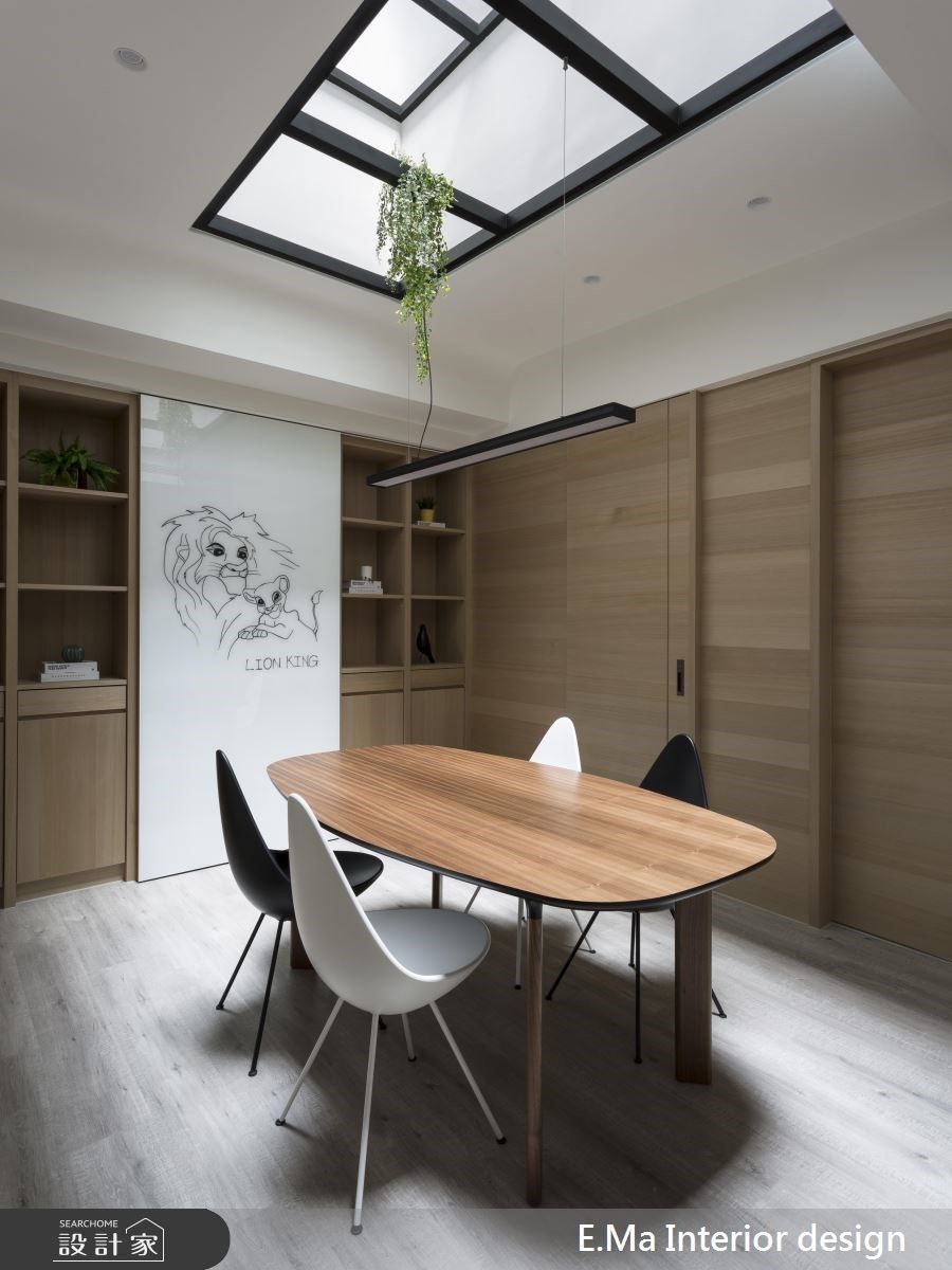 四樓是孩子的快樂天堂,以自然舒適的木質調營造如小木屋,天花則以雙層挑空鑿出天井,讓仰頭而望也有一番風景,不僅引光灑落,打亮孩子的陽光笑容,朗朗的讀書聲也分外起勁;而不甘寂寞的日光隨順樓梯而下,把三樓也照出爽亮感。
