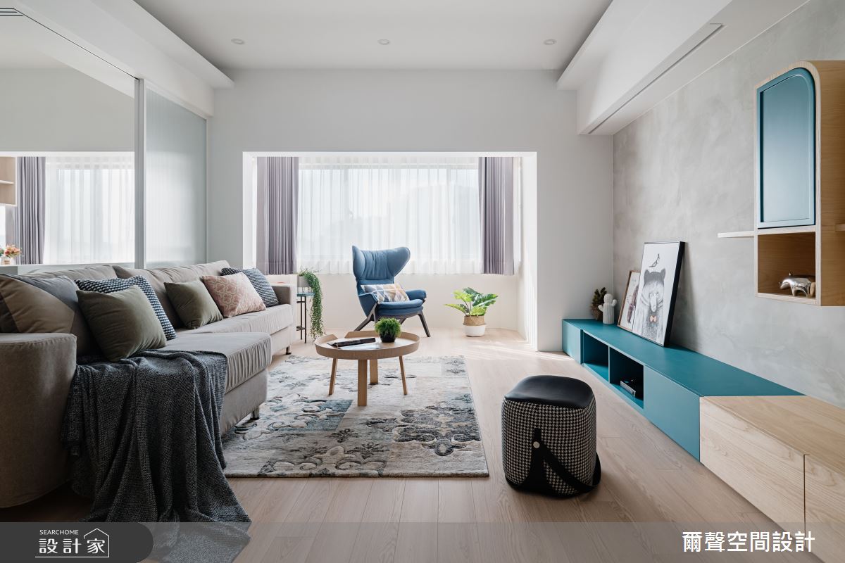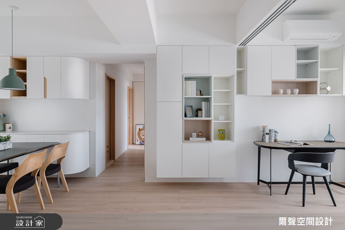 Home Data此案為35坪中古屋翻新,由於年輕的屋主喜愛活潑質感的北歐風私宅,利用藍綠色調的局部妝點,且以開放展示層架的收納設計,讓視覺更顯層次與變化;而考量家中未來新成員的報到,部分書房將規劃為未來小孩房使用。