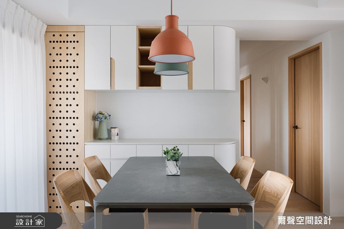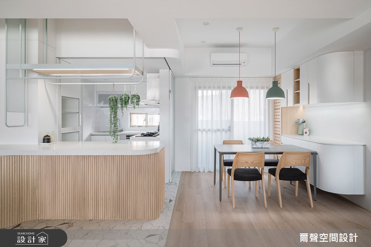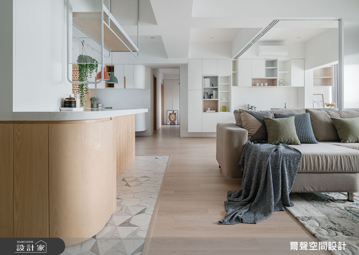 面臨空間格局較為零碎,設計師利用開放式規劃,伴隨充沛的採光,讓視野更顯開闊、明亮。為了讓玄關保有獨立性,且不會一眼望向走廊的底部,藉由入口鞋櫃串連中島的手法,巧妙將玄關延伸至廚房,並在地坪利用花磚鋪設出專屬領域,櫃體以白、淺色木紋兩色搭配,構築清爽、療癒的北歐風格。電視牆鋪上水泥般的樸實質感,搭佐兼具收納與展示機能的懸空木紋櫃體,與下方電器櫃相互呼應,展現輕盈、活潑的壁面風貌;沙發後方透過低矮櫃體以及玻璃滑門界定出書房區,拉出寬敞開闊的空間感,同時做為未來的小孩房之用。餐廚空間以中島為界線,中島的側邊則以格柵、圓弧造型展現,替烹調、用餐領域挹注溫潤、流動的視覺感受。