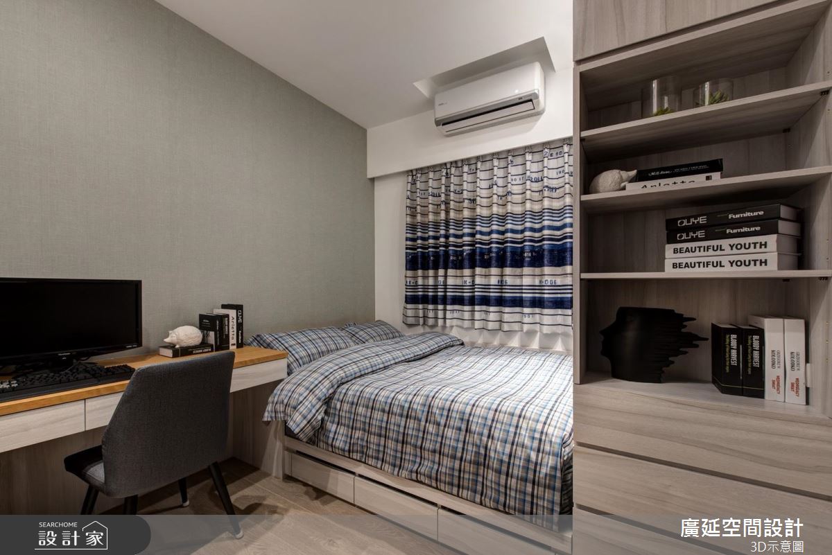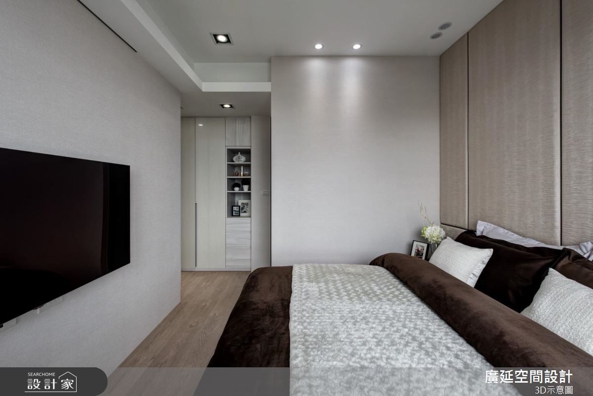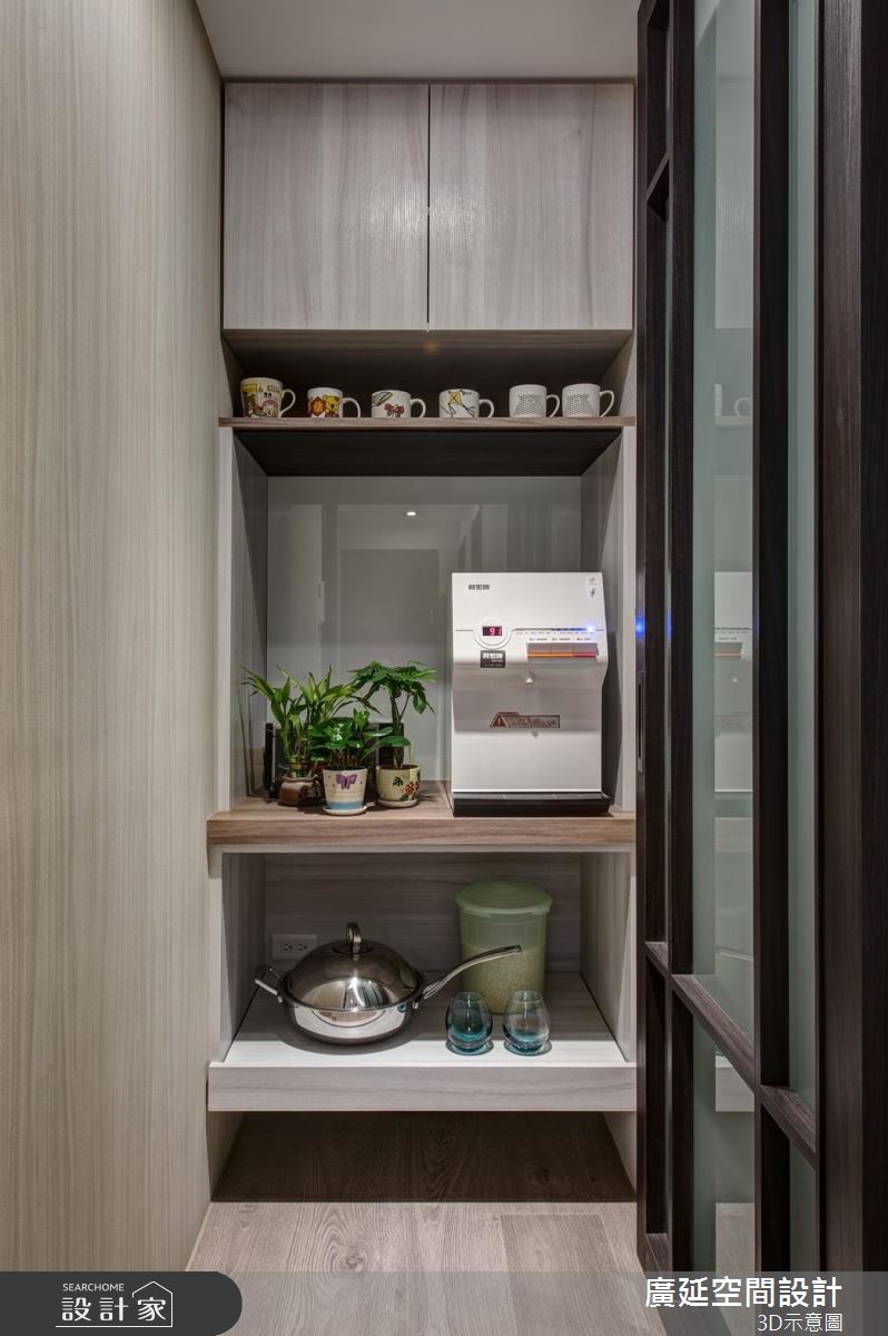 玄關區域鋪陳整面收納櫃,一路延伸到客廳主牆,替玄關、客廳場域做出完美銜接;空間整體採以淺色作基底,添入木質語彙勾勒溫潤氣息,同時挹注開放式規劃、減少實牆隔閡,僅用量體及家具等界定使用主題範圍、梳理流暢的動線,形塑舒適美型的廳區視野;廚房則安排於餐廳門片後方,且考量使用需求,額外安排一座餐水櫃,用以收納物件與器具,構築宜居的生活機能;主臥床頭則藉由布面鋪陳,加以溝縫線條分割,展現細緻的立面表情,搭配著美好窗景與溫潤的建材運用,營造舒適質感!