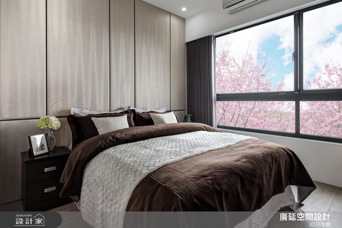 臥房內規畫大尺度的玻璃窗景,除了攬進美好日光,也把櫻花樹景色攬入室內,將窗面化為最迷人的構圖!