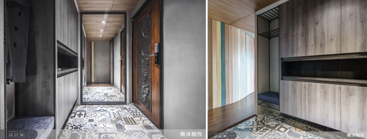 玄關空間有限,但樂沐團隊在這裡反而採用色彩鮮豔的花磚,配合比大門還大的穿衣鏡,放大視覺空間;而穿衣鏡下隱藏了弱電箱。體積龐大的鞋櫃顏色呼應花磚的藍灰色系,中間挖空的展示空間粗框再呼應穿衣鏡的立體粗框,虛化櫃體壓力(左圖)。在鞋櫃旁的衣服吊掛處,以特殊處理的鋼筋呈現,同時配備椅墊做出穿鞋椅用途,空間多元利用(右圖)。