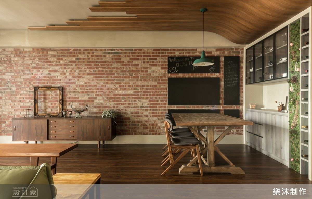 與客廳連成一片的餐廳,牆面上做出磁性黑板牆的幾何裝飾,不但在窯燒文化石牆製造變化,也巧妙隱藏電箱。延續玄關藍灰色調的收納櫃,特別挑選一排空間營造綠色立體牆,不但虛化櫃體的壓力,更引進綠意,讓牆面頓時生動活潑了起來。