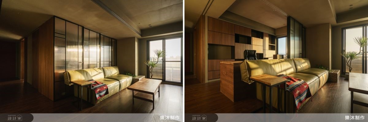靈活運用的推拉門,是增加空間使用坪效的最佳利器之一。沙發背後的書房以復古的長虹玻璃與一面實牆隔間(左圖),拉開後,隔間牆可以完全與收納至主臥室的壁面,形成開放空間。書房裡的收納櫃計算過視覺效果,部分開放、部分有櫃門,也能適時減輕櫃體壓力,收納機能不變(右圖)。