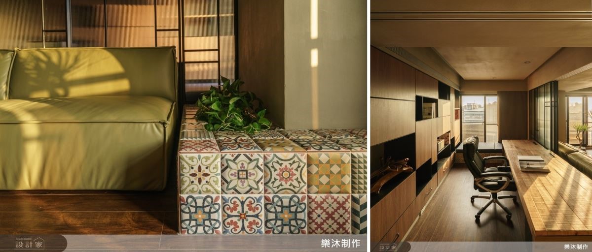 客廳靠近落地窗的樑柱有個畸零空間,加上主人有邊桌的需要,樂沐團隊靈機一動,利用色彩比玄關地磚更豔麗的花磚拼貼出高約 30 公分的檯面,並且做出內嵌設計,無論放盆栽或書都好,成為主人靜心的小角落(左圖)。花磚拼成的檯面一路延伸到沙發背後的書房,變成具有收納功能的臥榻,狹長的書房刻意把書桌分為高矮 2 部分,一來區分使用範圍,二來也不至於長長到底的書桌形成空間壓力(右圖)。