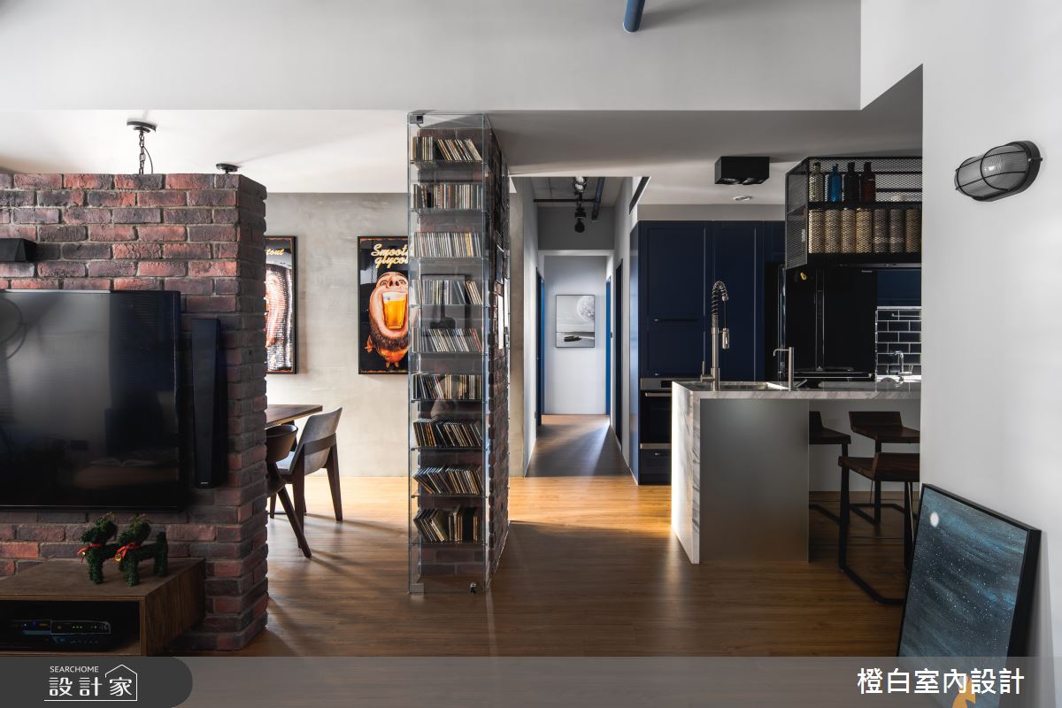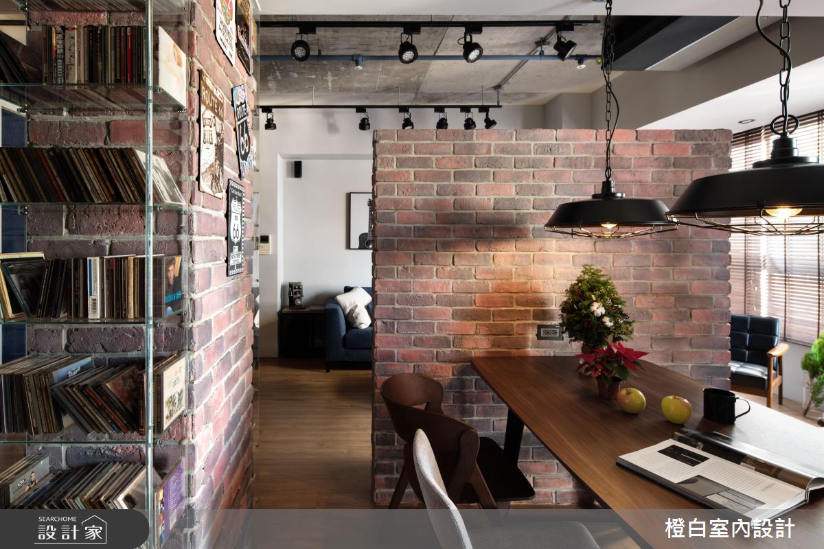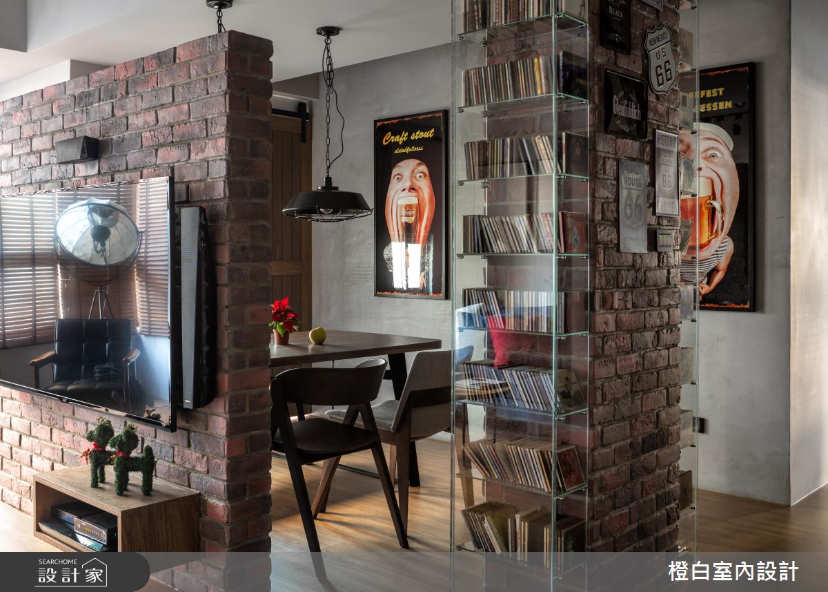 身為音樂與當代藝術重度上癮者的屋主擁有上百片CD與各種張力豐富的海報畫作,這樣的藏品不該只是單純規劃可以收納的地方,而是應該反其道而行,利用這些獨具個人特色的藏品形塑居家風格。一進門,迎面而來的就是復古紅磚打造的電視矮牆,但隨即就會被結構柱上的CD蒐藏給吸引,柱體兩面用玻璃打造陳列架,另外兩側則依照心情懸掛或黏貼復古的傳單或招牌。矮牆背後的用餐區則用視覺效果強烈的三連幅海報作陪襯,搭配軌道燈、防爆燈及經典的工業風網狀吊燈,讓住宅充滿濃濃的個人品味。