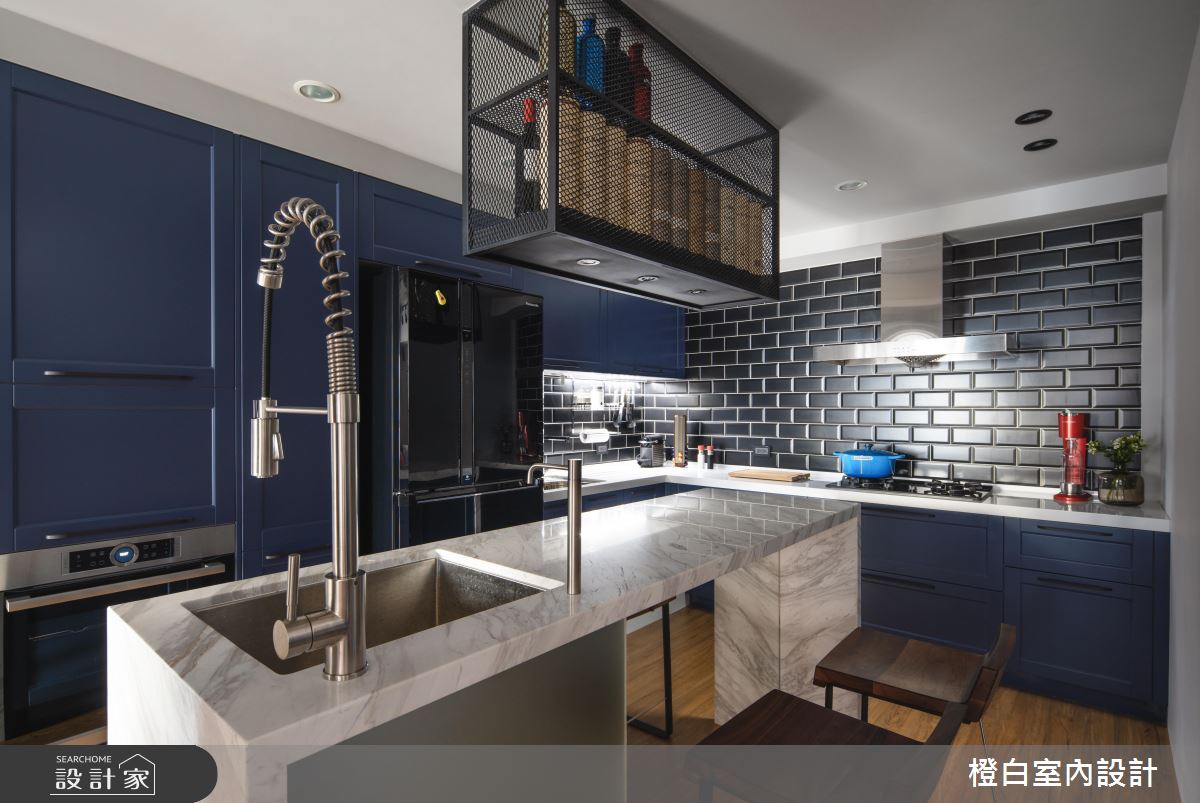 玄關普魯士藍色收納櫃呼應右手邊的ㄇ字型廚房,白色大理石搭配靛藍櫃體展現都會雅痞的個性。進入寢居空間後風格稍微轉淡,從牆面的用色、百葉窗的挑選以及床頭海報裝飾讓空間巧妙地轉為優雅的現代設計。衛浴空間延續了廚房配色,白色地鐵磚搭配白色填縫劑被黑鐵框出現代魅力,乾濕分離的設計擁有獨立淋浴間與蛋形浴缸,打造五星設計旅店等級的奢華沐浴體驗。