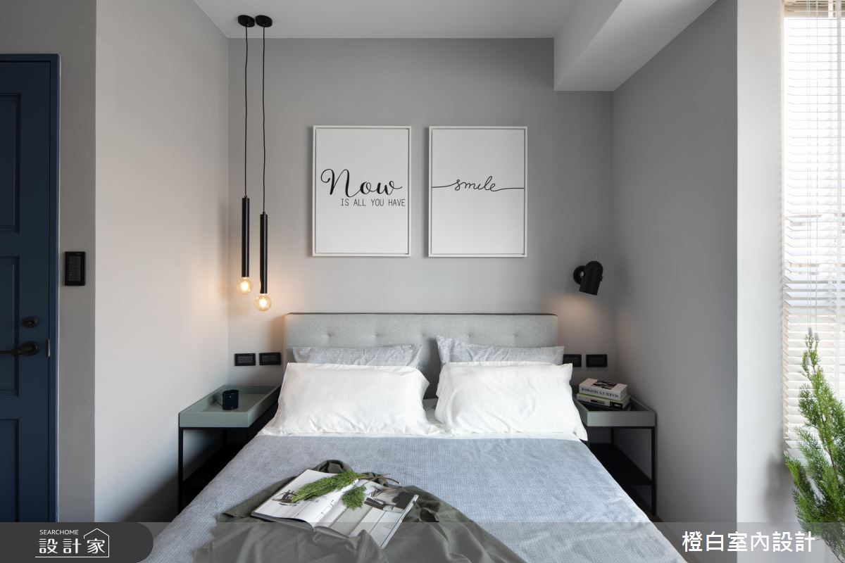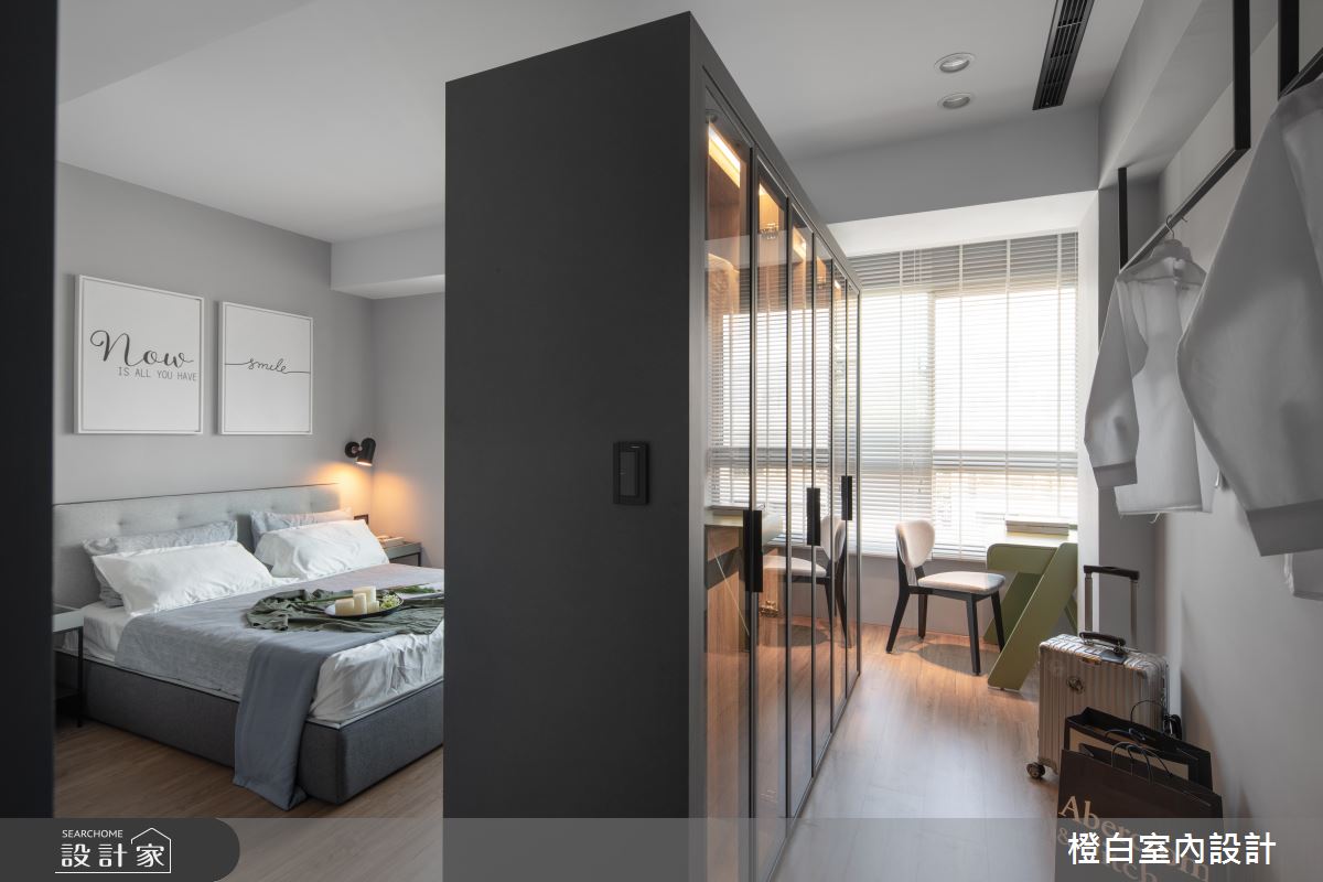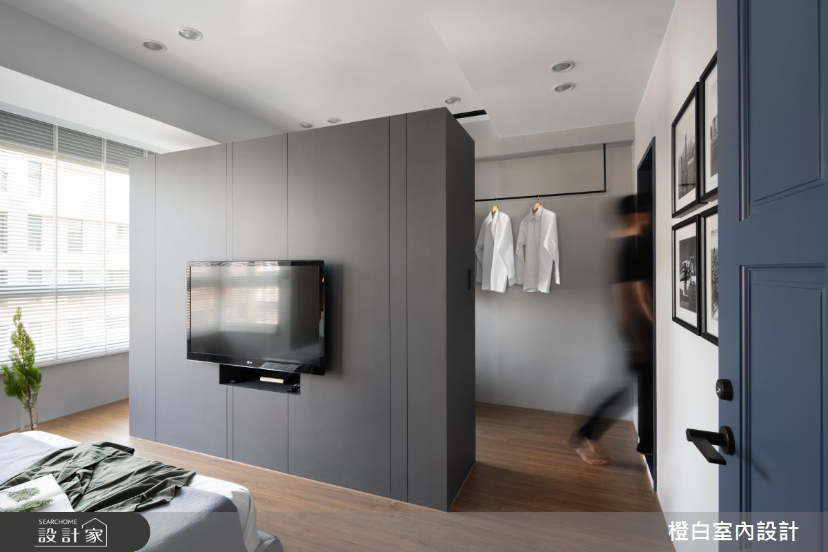寢室拋開傳統的衣櫃設計,利用電視矮牆的背面規劃透明的衣櫥,搭配牆面可以自由懸掛襯衫衣物,地面也可以隨手放置購物提袋或行李箱等私人物品,比起獨立更衣間更來得有創意,更自然地塑造了通往主臥衛浴的動線。