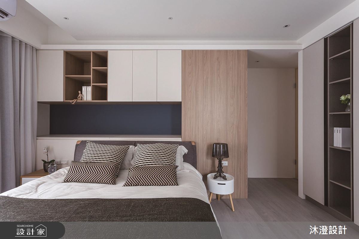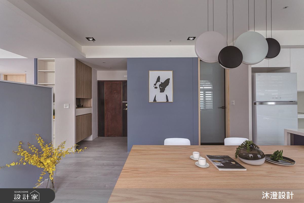 格局部分,規劃開放式廚房及餐廳,並配置半腰式的電視牆,區隔客廳書房跟餐廳的區塊,將整個公共場域串連起來,擘劃流暢的行進動線;配色上,從玄關的灰藍色到公共空間的汝窯青色,搭配灰色大面基底,再以木質溫潤感襯托,讓整個居家色調富有層次,且明亮溫度;主臥內,則於床頭局部襯佐英國藍色塊,搭配布紋的面板,讓空間質感瞬間提升!