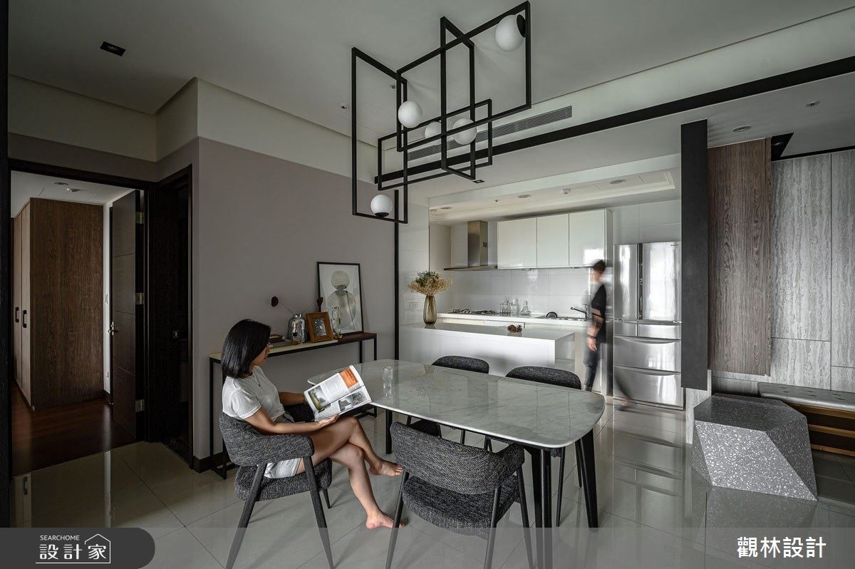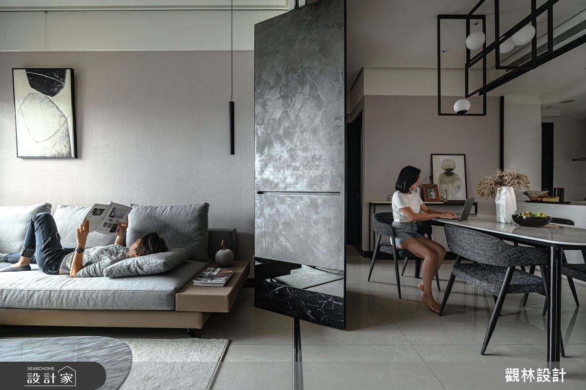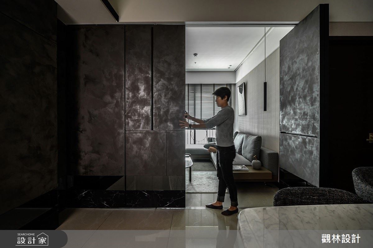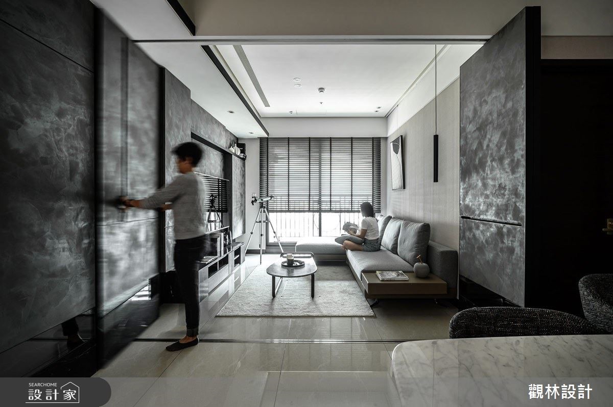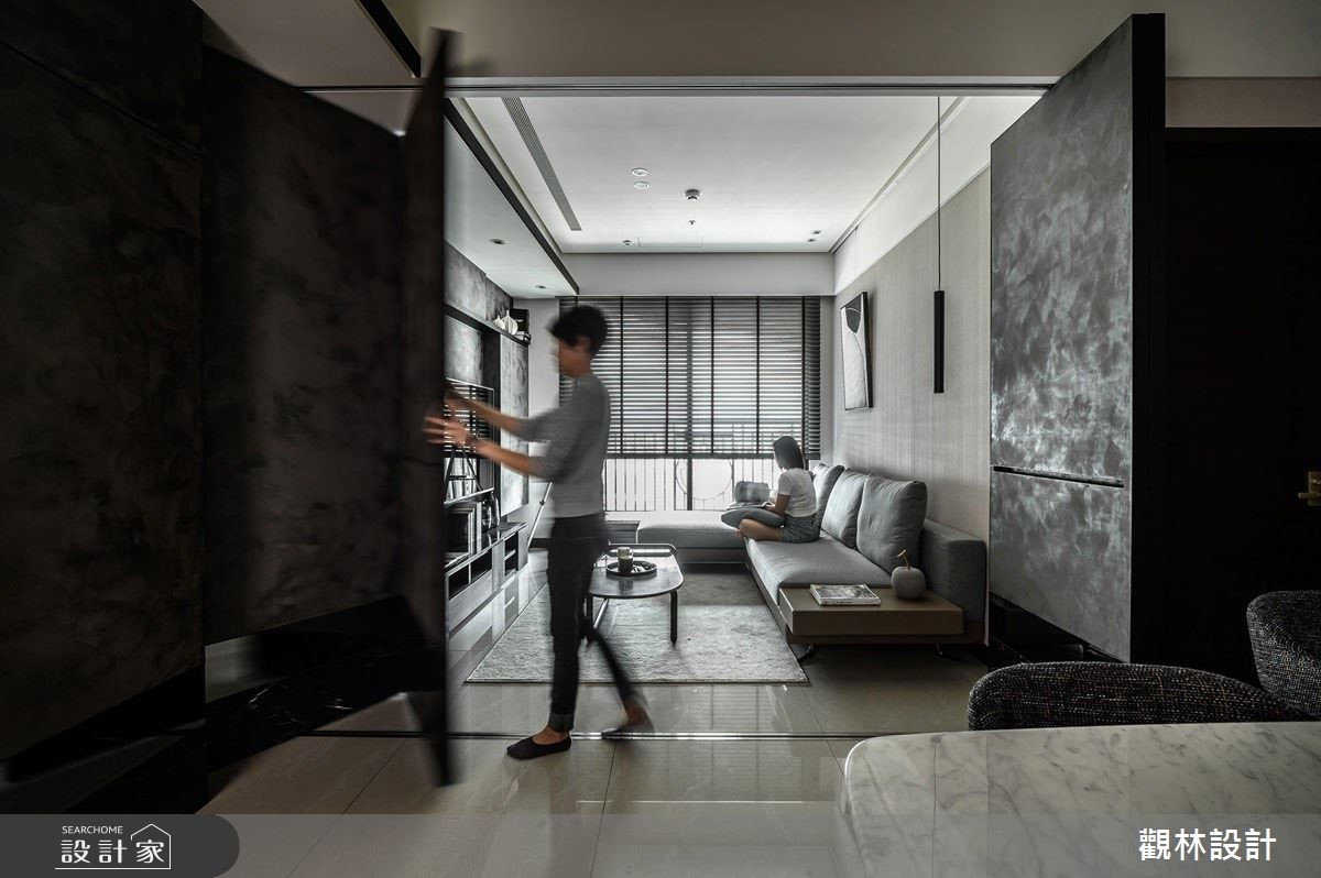 現代都會上班族群由於房價過高,多以租房取代買房,而城市人口密度逐年增加,同時也造成居住坪數受限。公寓住宅在有限的坪數下,如何有效利用空間?租屋族群如何過有品質的現代生活?因此觀林設計在此案的核心價值便是「空間放大最佳化」、「公私領域彈性化」,讓居住者能夠享有舒適愜意的家庭空間,同時考量到承租者彼此間的生活型態可能略有不同,因此在客廳與餐廳交界之處,設置拉折門作為彈性空間的應用,可以一人在客廳慵懶觀賞電視、另一人在餐桌愜意閱讀,打造多元型態的生活樣貌。