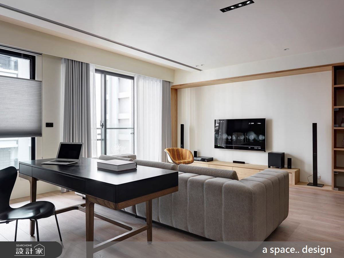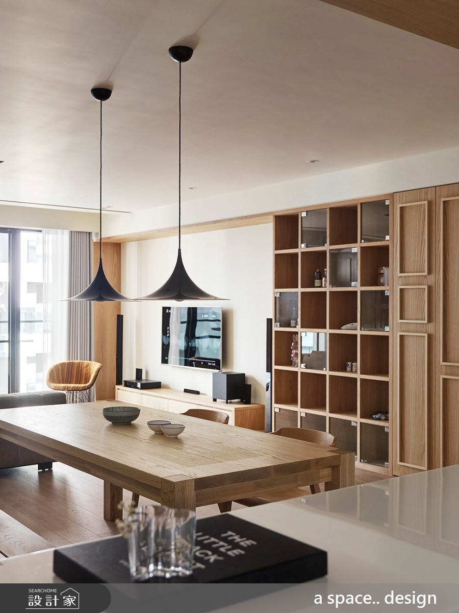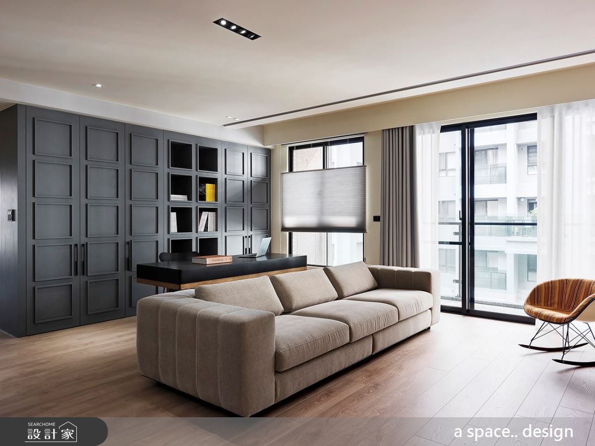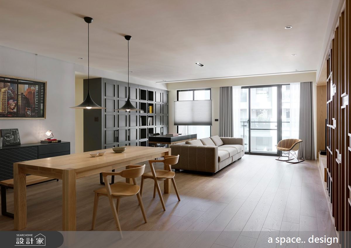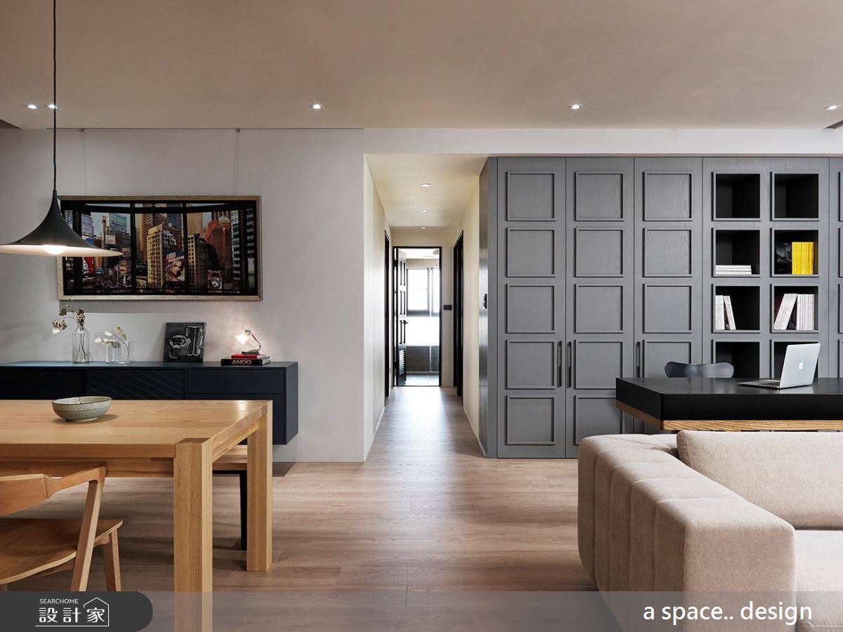 些微架高的木地板界定出內外領域,由於玄關的天花板巧遇大樑,利用木紋肌理妝點,弱化突兀的結構,且呼應整體溫潤的色調與風格。輕透日光伴隨落地窗走進室內,灑落滿地潔淨之感,刷亮木紋地坪的大地風色彩,烘托暖調情誼;玄關處打造滿滿的櫃體,大小不一的方格線板描繪出視覺層次與靈活變化,接著串連開放展示櫃,滿足屋主的收藏與美學涵養,營造出兼具美感與實用機能的壁面風貌。灰色調的沙發成為公領域的核心定位,界定客廳、書房與餐廳區,書房領域裡,順著樑下空間置入灰色調的收納牆,方形線板描繪出櫃體的典雅風範,而中央兩排特別以開放櫃體為安排,替空間增顯開放、流動感。
