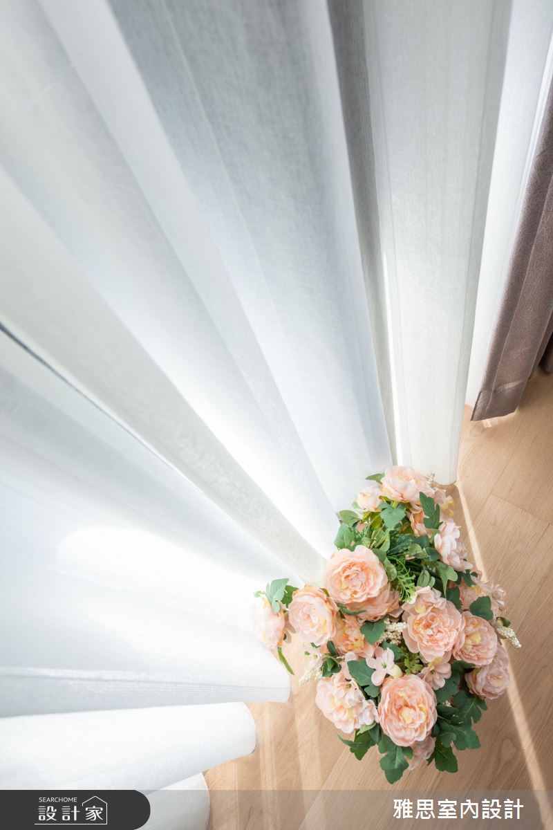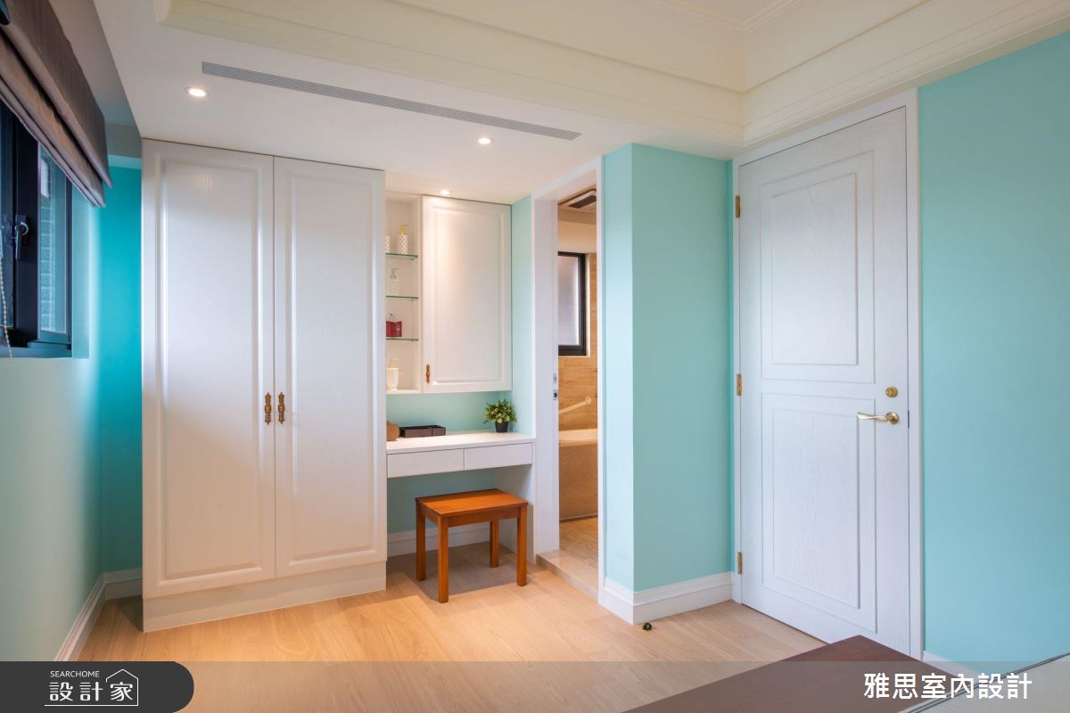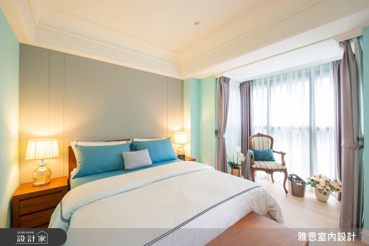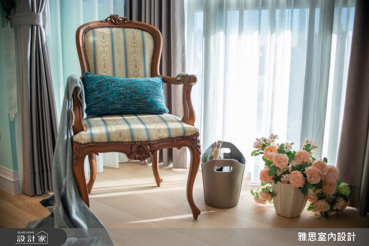 延續白色與淡藍色的優雅色調,在大面明亮的採光下,主臥內配置布花圖騰的復古木椅,佐以一旁的玫瑰花飾,譜寫出高貴典雅的宮廷感。