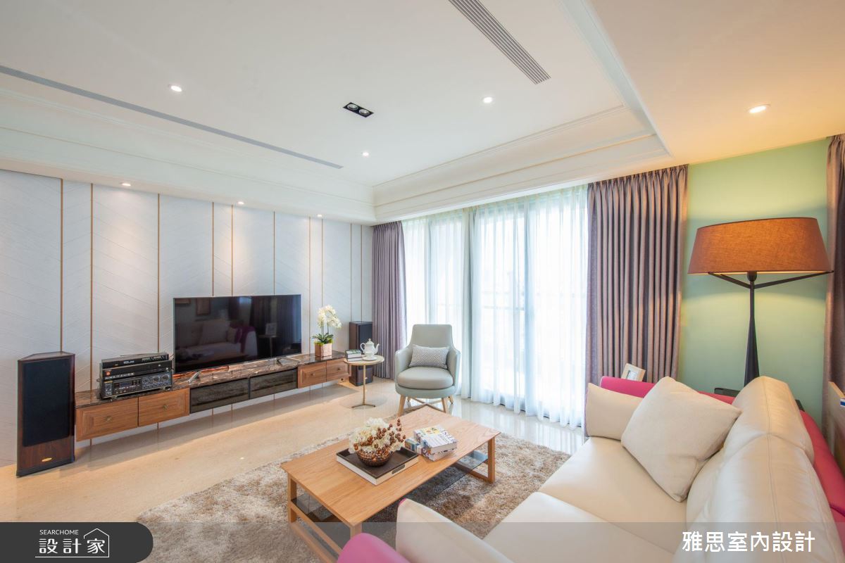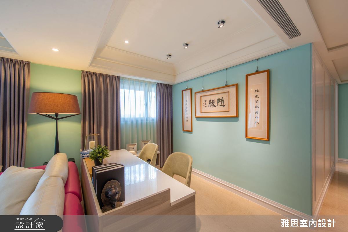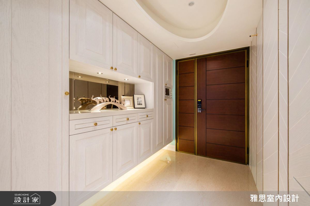 玄關區域於天花刻畫圓弧線版,在柔美與對稱中營造典雅氣息;接著以染白木紋向兩邊開展,右處的隱藏式櫃體,保留了自然雅緻的木紋質感,左處描繪著幾何線條,與俐落直截的金線一路延伸至電視牆,開闊了整體視野,改造狹長通道,加上開放式格局,複合客廳、餐廳與書房,使得公共領域產生放大的視覺效果;天花板造型以簡約的線版刻畫,去除樑柱的壓迫感,詮釋出豐富層次,界定出各個生活場域;餐廳作為凝聚情感的天地,帶有透視感的茶玻收納櫃上,展示著象徵傳承的家族紀念,在古典風格中注入了一絲溫馨恬靜的氛圍。