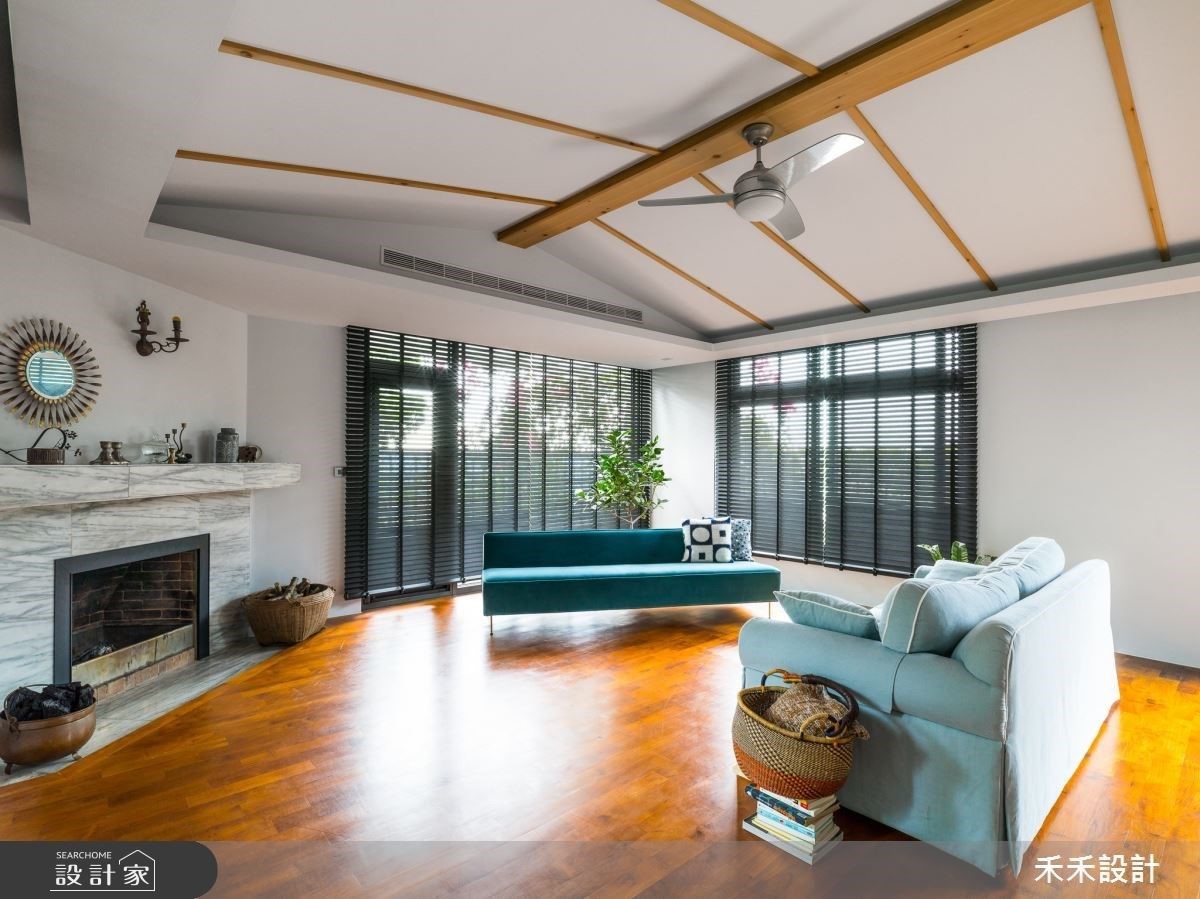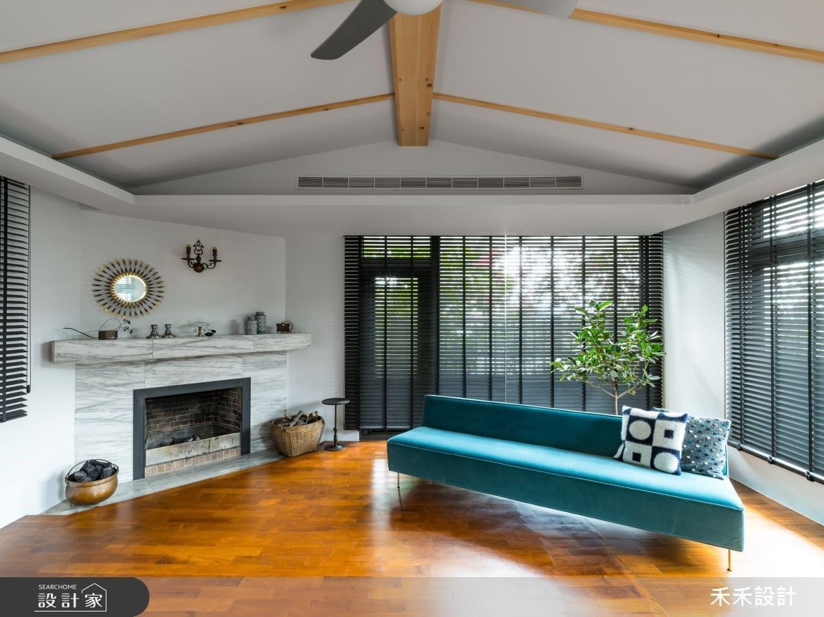 呼應地坪的柚木元素,於客廳原有的斜屋頂,以松木條裝飾如裸結構,憑添樸質的鄉村語彙。且保留抹平屋角的真火壁爐,於灰色流紋的大理石以黑鐵加框,隱約而見內部深處的紅磚;石上檯面可陳列風格小物,散發山中歲月的悠閒與溫馨。