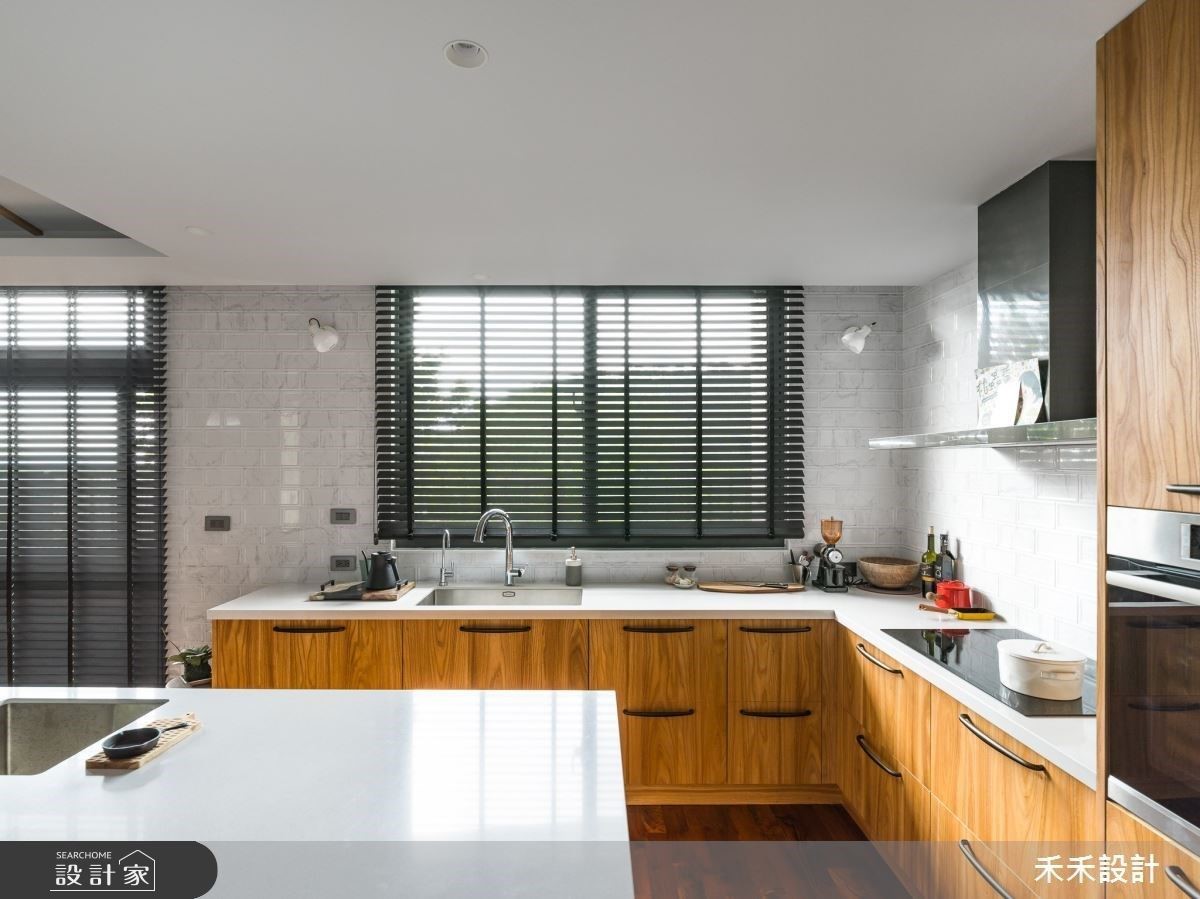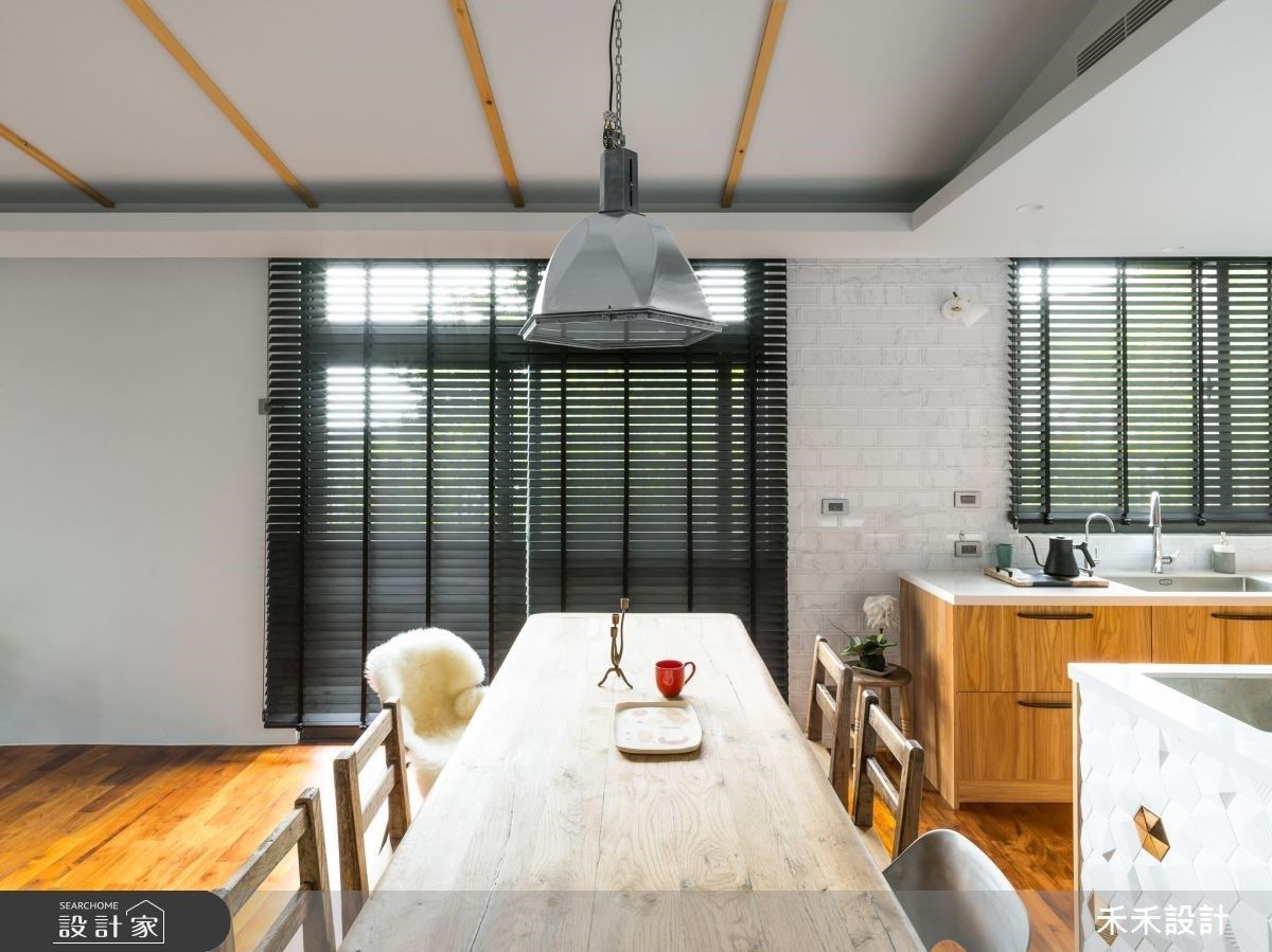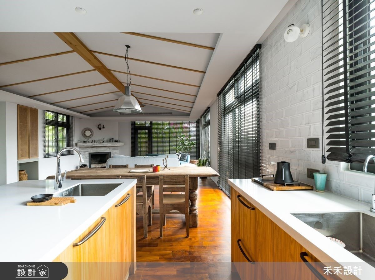 打開餐廚隔牆,讓視野延伸朗朗磊落的尺度,但以一張長木桌為無形分界,既可和客廳沙發串連對坐聊天的動線,又互搭了廚房的美味空間,特別是中島下方拼貼的立體六角磚,更見陽光反射的層次,讓一餐美食也有眼光停佇的細細品味。