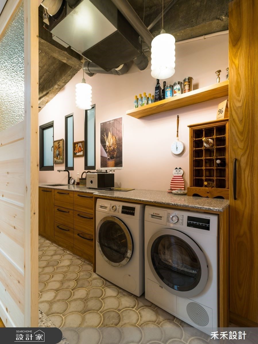 狹長型的洗衣房,天花裸露結構,地坪鋪上復古的魚鱗磚,呈現半戶外的空間感。沿牆裝置的洗衣機連同收納櫃、水槽,以人造石框成工作檯,滿足餘暇釀酒的興致,又能收藏雜物,賦予多元機能,而釘上層板掛上畫,更有隨手裝飾的生活感。