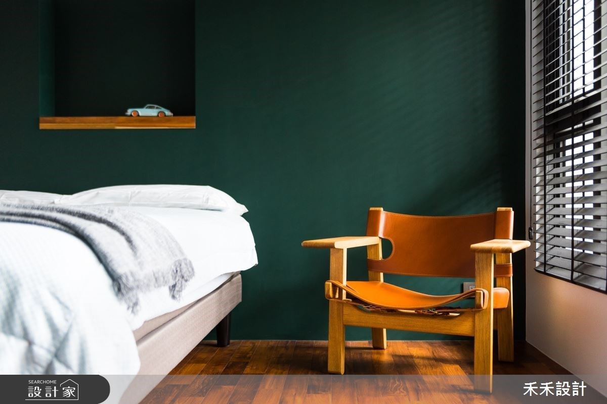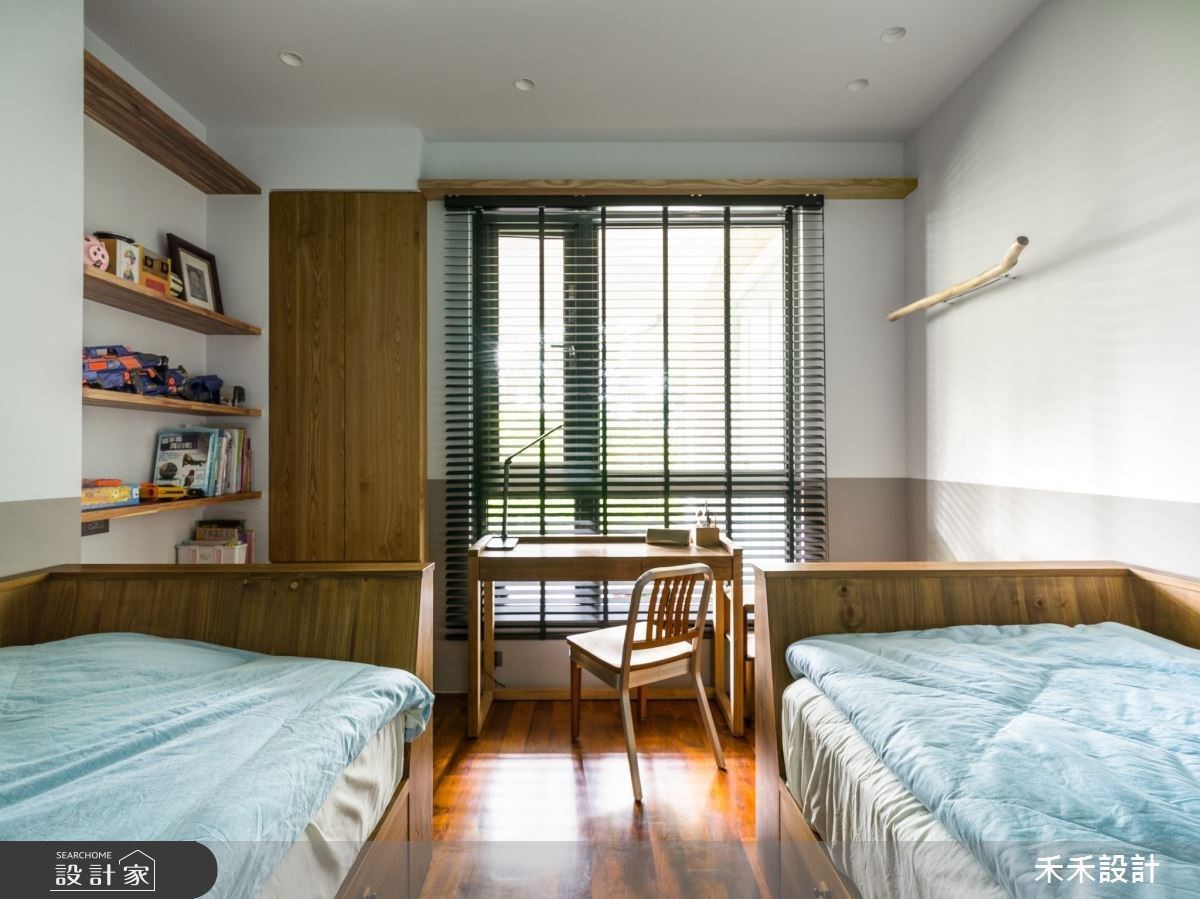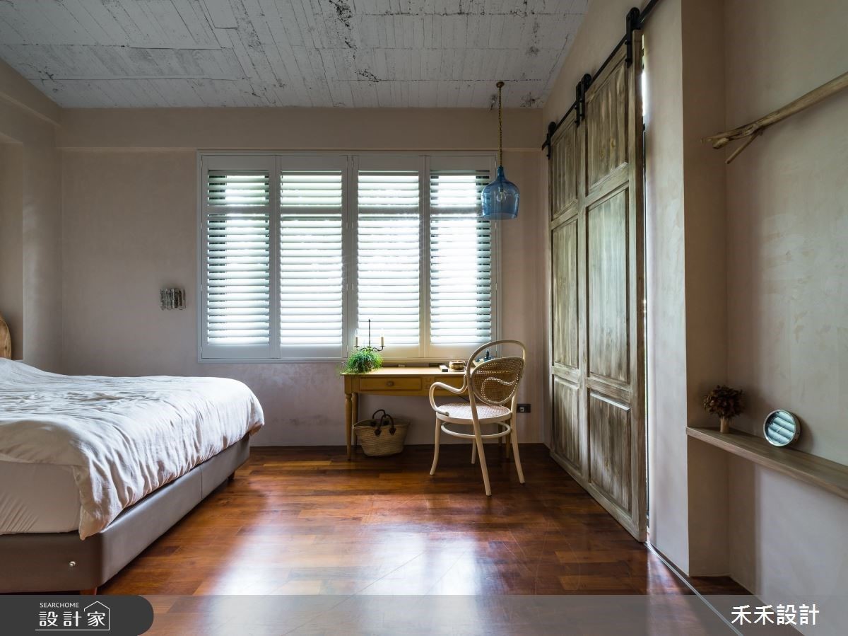 為延續自然古樸的氣息,將主臥斑駁的天花刷上白漆,再將床尾面對的中庭鋁門,遮以仿舊的松木拉門,減少強光又透空氣,且搭襯一塊層板一截木桿,更見生活自由自在的興味。小孩房於對稱的活動床之外,也以玩具掛桿俏皮裝飾牆面。