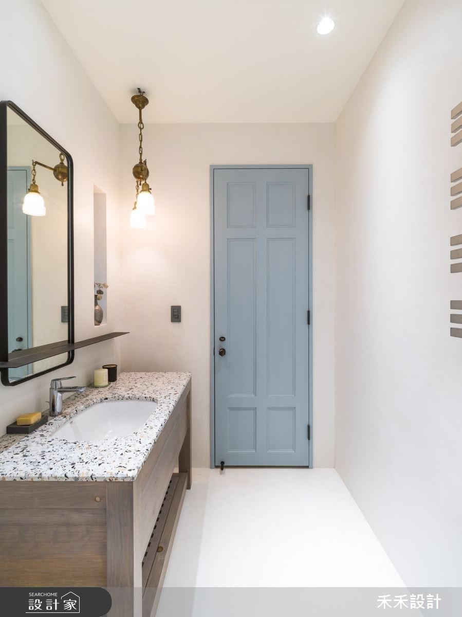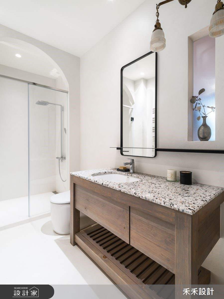 衛浴以淨白的義大利防水塗料,呈現極簡的色調,頂多以木作櫃鋪上復古的水磨石為檯面,再搭黑色的弧角鏡框,揉合自然圓潤的質地;或借窗台凹洞採擷戶外陽光點染綠意,感受時間的流動。洗手台下的格柵板,既呼應木櫃也可掀開清洗。