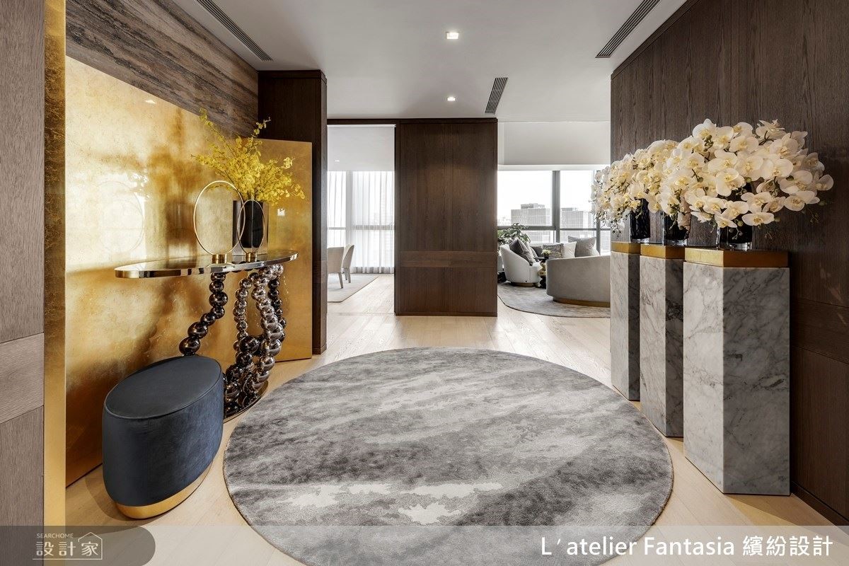 入口玄關以金箔屏風襯托雕塑藝品的優雅形貌,在金屬工藝的精工雕琢下,展現雲端豪宅的雍容大器。
