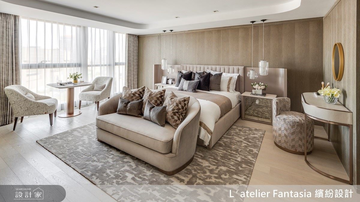 主臥貼心運用各面空間規劃出休憩聊天、造型梳妝等空間,完美刻劃起居機能,更在溫潤木色及軟件的鋪陳下,營造沉穩舒適的睡眠氛圍。