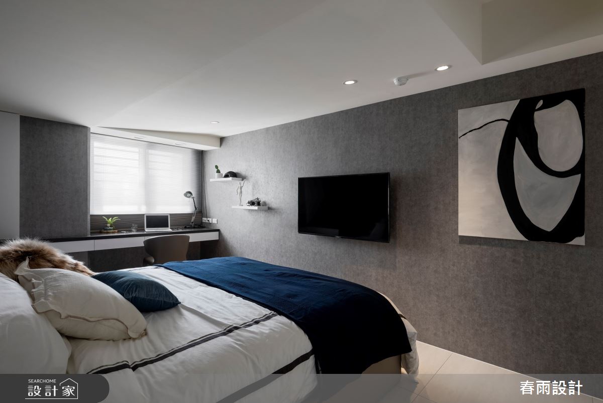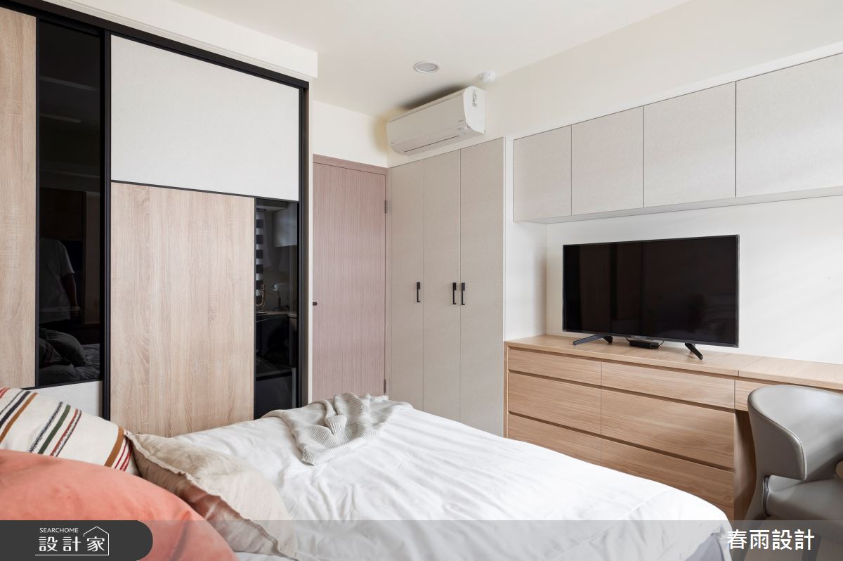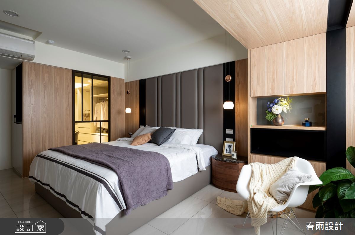 寢室多利用木作結合系統櫃將收納統整於平面優化寢室動線,男生房天花板樑柱橫越床鋪藉由斜面修飾並增添造型;主臥房則巧妙地運用木皮造型連貫方式加上燈光佈局虛化樑位,也將床頭隱藏收納與主臥衛浴的滑門整合在一起,打造獨具整體特色的主臥休憩區。隱身於門簾後方的開放式書房保有良好的對流,也充分利用長型臥榻下方以及壁面空間增加收納區。開放式格狀書櫃的滑門設計讓隱藏後方的樓梯下畸零空間可以變成簡單的儲藏室,堆放行李箱或雜物。