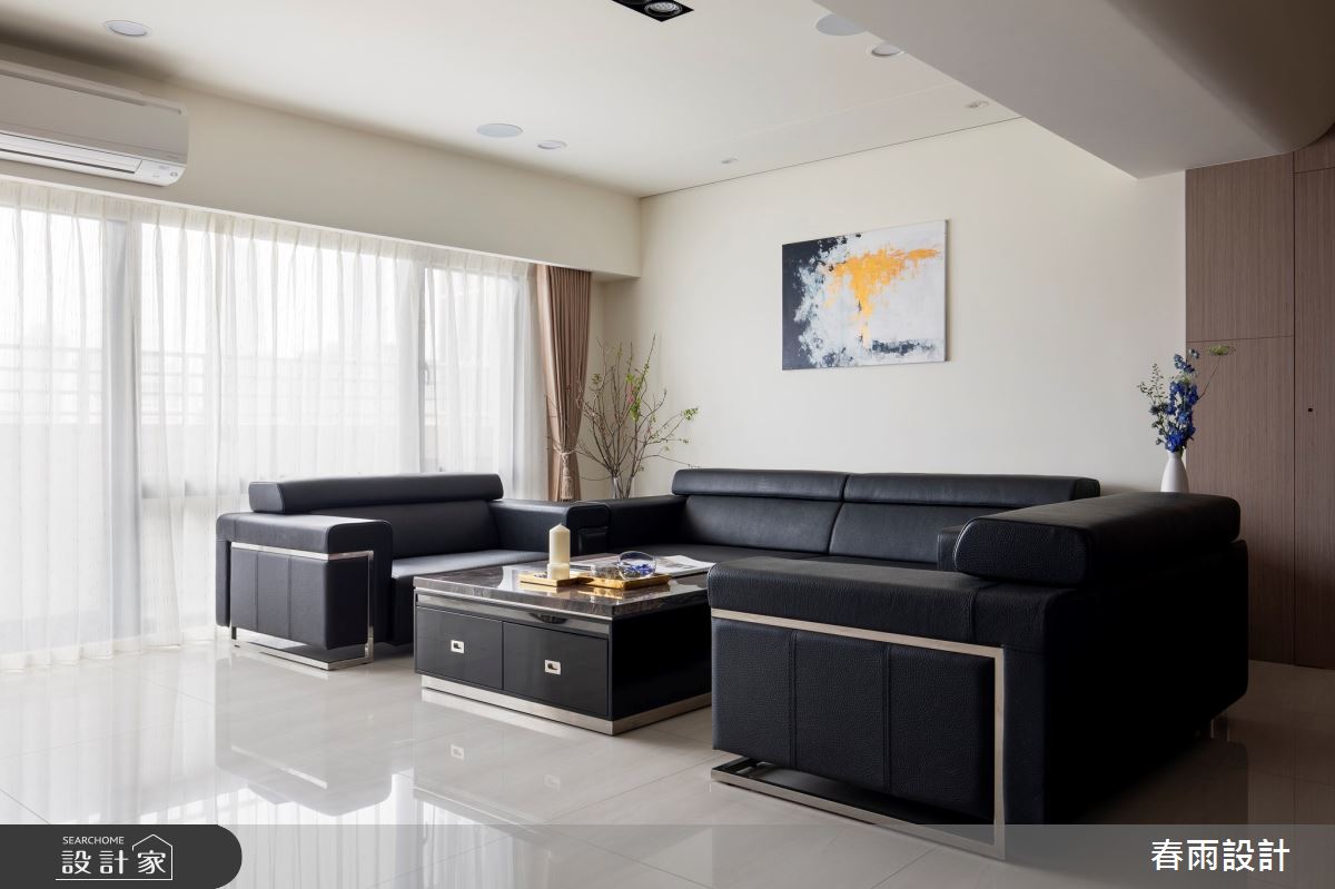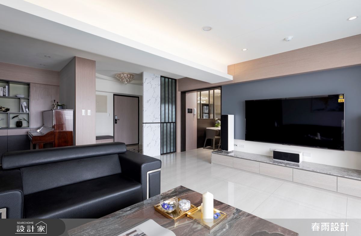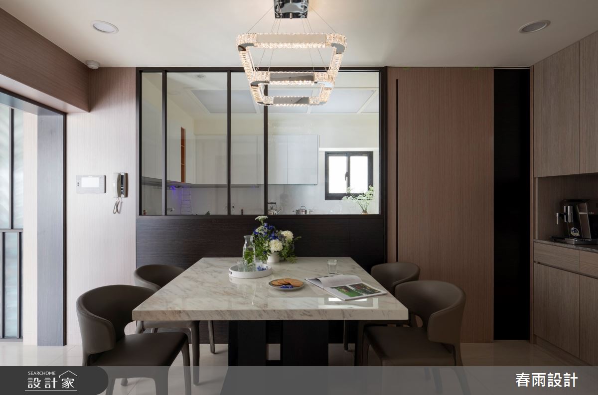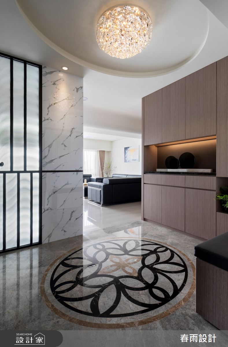 找來專業除蟲公司徹底清除老舊結構,重新做好基礎防水與防蟲後才進行室內格局的重塑。玄關處雙色大理石拼花造型搭配圓形水晶吊燈,鞋櫃增設透氣孔把手外,往內增設的穿鞋椅旁有簍空設計用來放置隨手包,上方長型的空間則用隱藏抽屜櫃提供環保袋與雜物更多棲身之處。穿越鐵件玻璃拼接石速板的屏風是透著光線的客廳區域,灰色烤漆電視牆搭配氣氛燈營造現代感,右側身高櫃上方增設透氣孔,音響設備不用擔心過熱,高櫃體更方便使用站姿操作。玄關與客廳橫越的樑柱利用曲面修飾,並透過間接照明層次來化解玄關處屋高太低的問題。挑選方型餐桌搭配方形水晶吊燈形塑空間特色,緊鄰的廚房隔牆上半部以玻璃鐵件增加餐廚的通透性,下方則以木作包覆,滑門設計讓餐廚區可以視覺上開放但又能有效阻隔油煙。