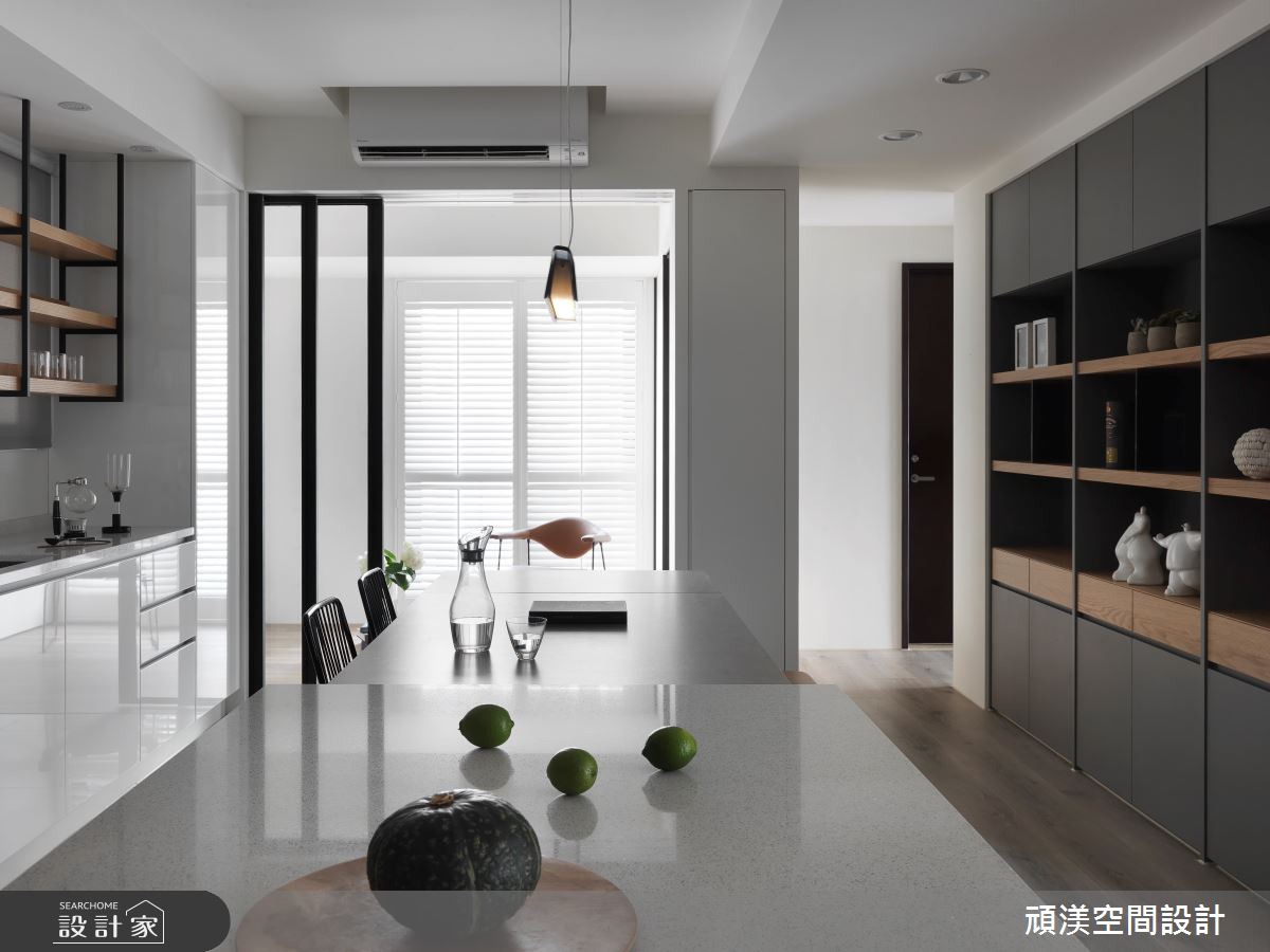 整個空間揉合自然光線,在灰階、木櫃、地板及格柵門的佈局下,巧妙跳脫了風格框架,看似無為實則細膩的溫潤質感,像是爸媽溫厚的臂膀,默默守候異鄉遊子回家共餐的幸福時光。