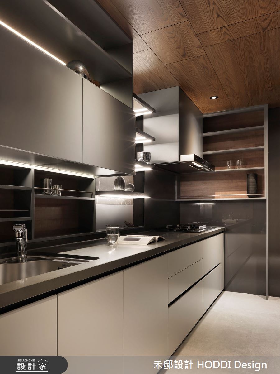開放式設計打造寬敞的公領域,加上落地窗的優良採光,將焦點落於客廳區域,並以主樑和地板、牆面的材質變化,界定餐廳和兩個書房區域,使得夫妻兩人能一同閱讀、工作,同時保有隱私和獨立性;以大理石牆為電視襯底,藉由上下延伸的灰玻璃,與燈光鋪排的巧妙映照,創造輕盈通透的微奢感;為滿足收納需求,一路由玄關處、餐廳、廚房至更衣室,打造大篇幅的隱藏式櫃體、開放展示架,更依實用性調整高度,兼顧了美感與機能。