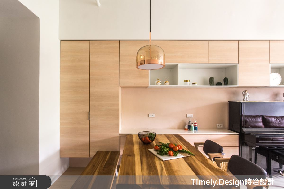 踏入玄關處,迎面而來的開放式餐廳,旁側運用系統櫃的整合鋪排,緩解餐廳樑柱的壓迫感,更規劃出大篇幅的收納空間,維繫簡單俐落的室內風格;公領域的開放式設計,放大視覺感,客廳也能享有絕佳視野與採光,電視牆以珪藻土襯底,呼應自然天成的居家語彙;兩間小孩房則運用系統櫃體作為隔間,滿足彼此的收納需求,更創造獨立且隱密的個人天地。