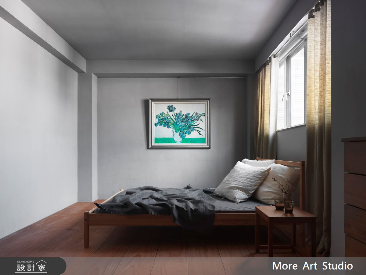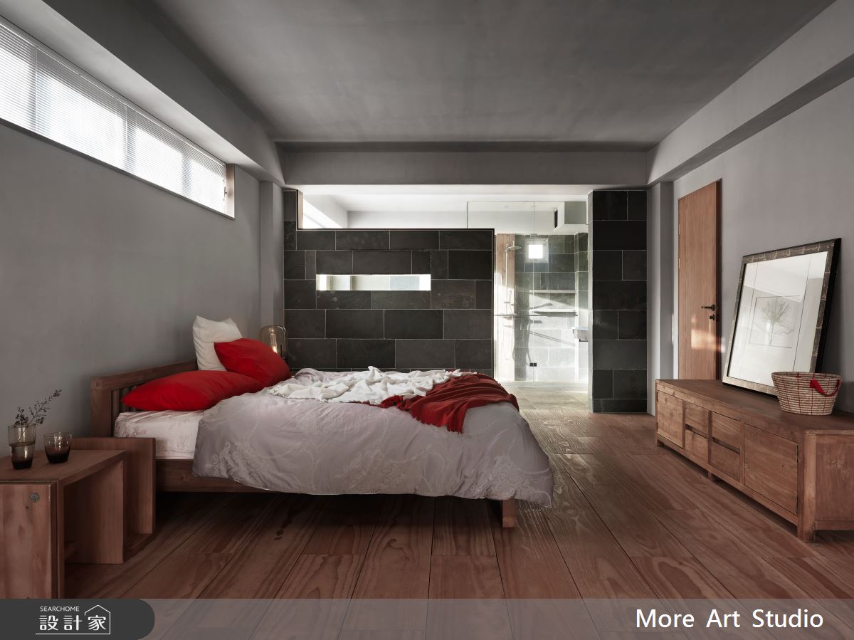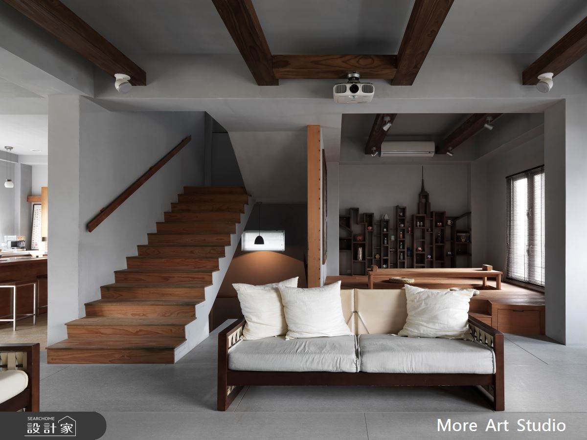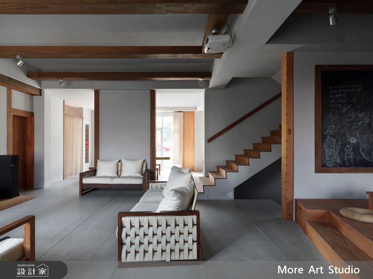 客廳天花板以實木橫梁的造型呈現,化解大樑的壓迫感,深色木紋的局部點綴,為室內增添一絲沉穩的氣息;格局上以客廳為主,兩側採光面分別為客廳、廚房與用餐區,結合不做滿的牆創造彈性的領域界定,確立裡外;於玄關旁,規劃臥榻式沏茶區,開放式收納櫃結合展示功能,使得屋主的珍藏成為最個性化的裝飾;主臥延續淺灰色系,轉而以木作橫梁打造斜屋頂,並利用紅色單椅畫龍點睛,為室內注入一股活潑能量。