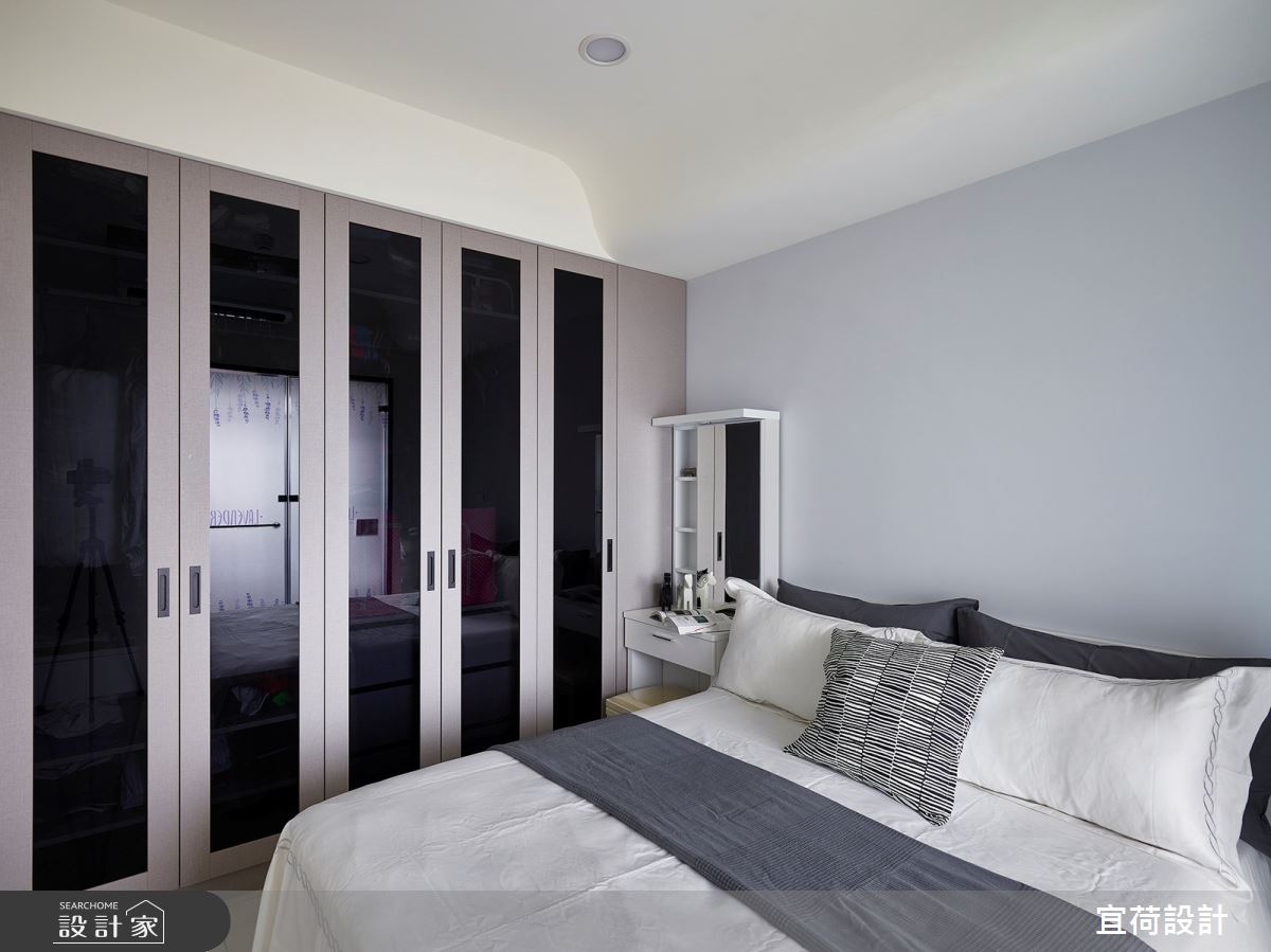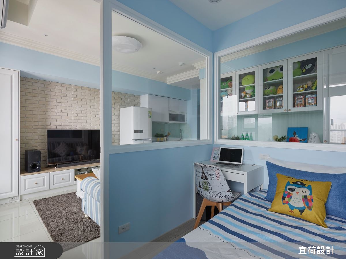 10 坪小宅客廳狹長且採光不佳,因此設計師將玄關櫃及廚房安排於兩側壁面,並與採光充裕的客廳區相鄰安排,呈現開放式一字型動線,使用順手外,也化解無窗地帶光線不足疑慮。沙發背牆採以玻璃半牆隔屏形式並延伸至廊道,讓新增的多功能客房不阻擋光影,並搭佐海洋色系壁面提亮室內空間,同時拉寬公共空間視野尺度。主臥也運用相似的設計手法,以玻璃取代傳統門片,讓臥房領域同時享有衛浴空間的好光線。