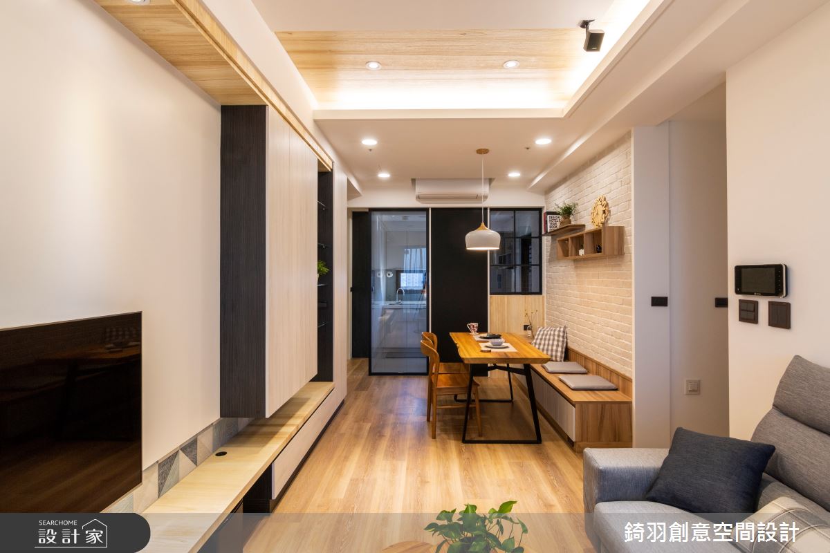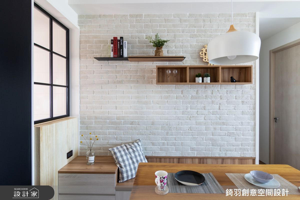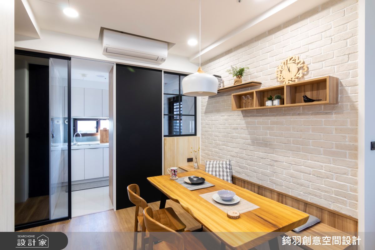 長型且坪數不大的公領域,微微更動了餐桌擺放位置,以臥榻形式長椅取代傳統餐椅,調整出單純且好用的使用動線,並搭配文化石背牆,打造舒適溫馨用餐氛圍。廚房配置上,依循建商原有的木質地板分界,予以半穿透式鐵件隔屏引入採光、阻擋油煙飄散,中間的黑板漆門片設計隱藏了冰箱位置,同時成為生活留言板及食譜菜餚紀錄牆,旁側的格子窗造型同樣予以推拉設計,增加室內採光,同時化身出餐口,妝點生活趣味。