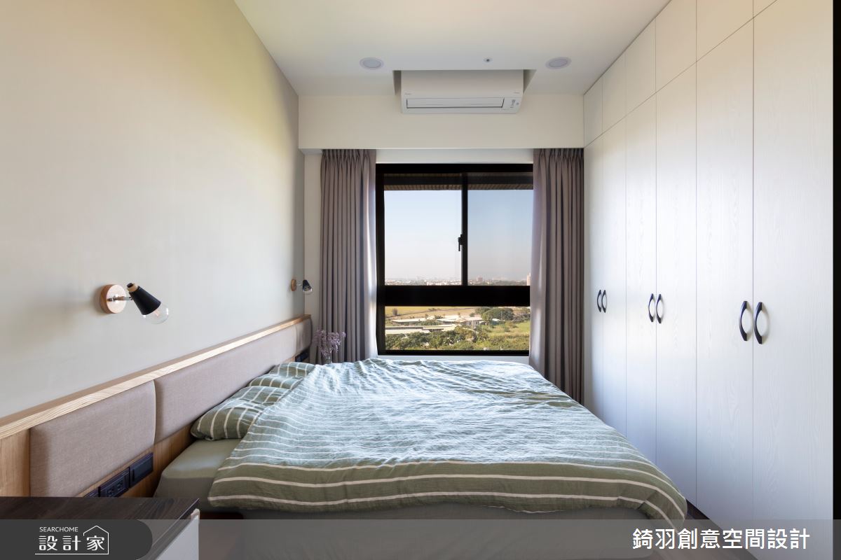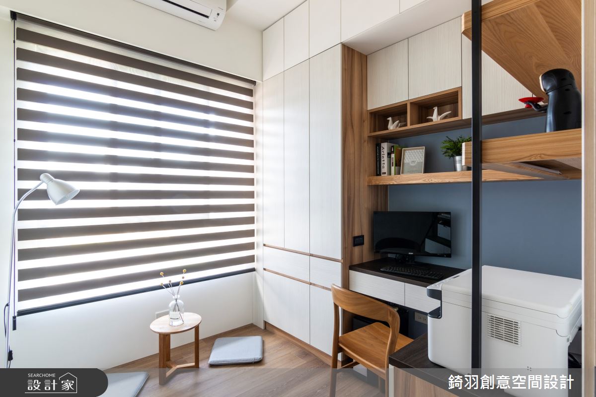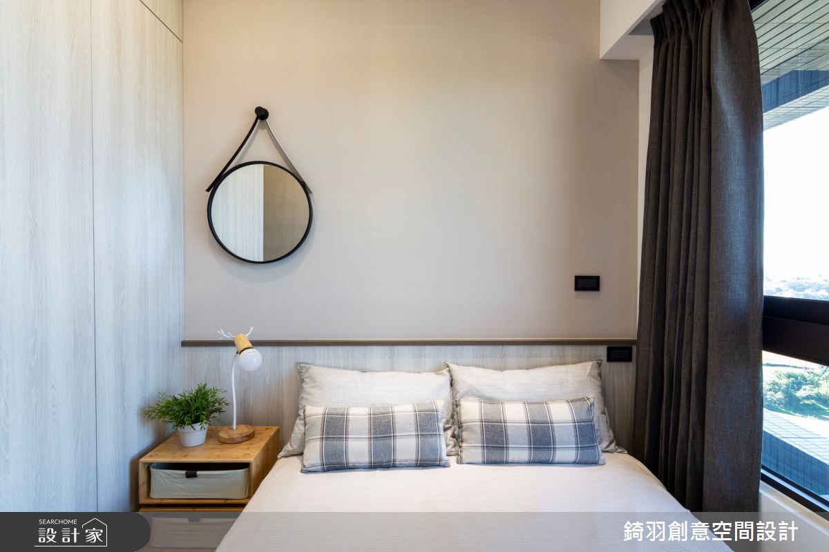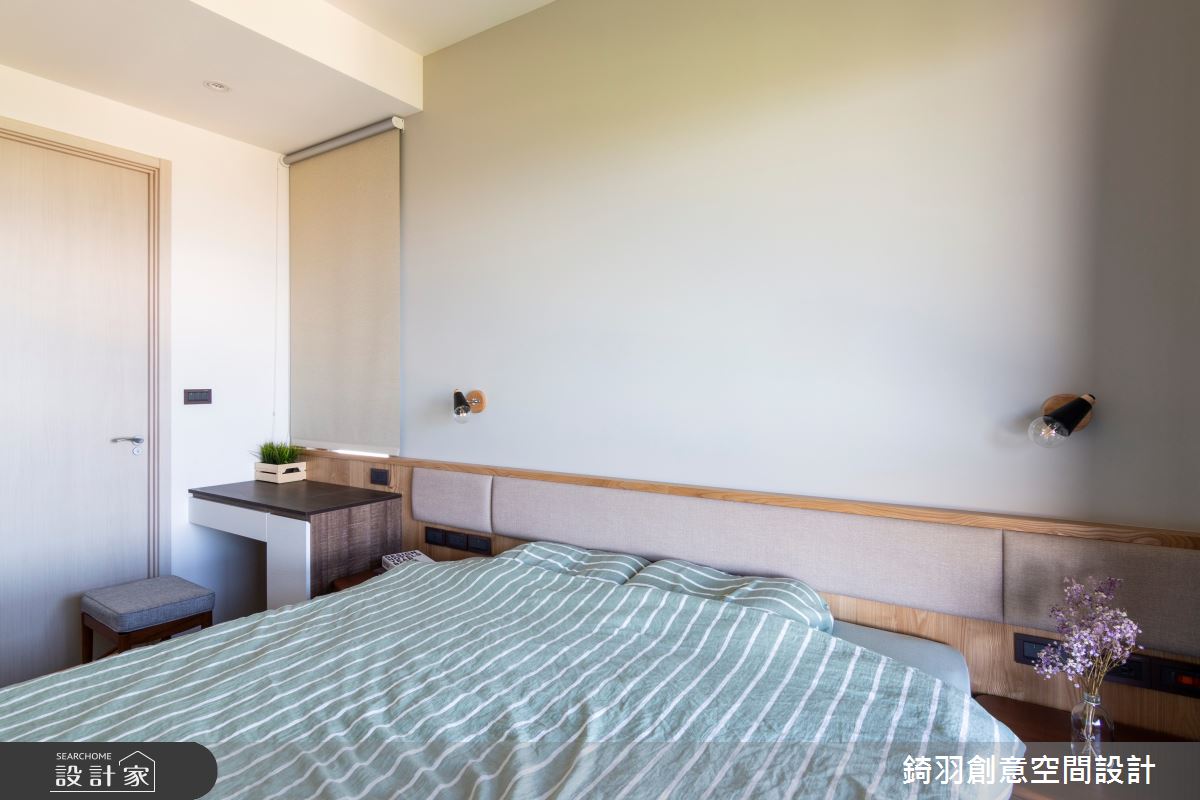 採光優秀的日系簡約客廳,選擇木質電視櫃搭佐沁藍色系花磚,營造清爽又不繁複的層次美;私領域也延續清新風格,並著重傢飾配置,透過床頭燈、牆面色彩或床頭造型,塑造截然不同的臥房風格。收納設計上則利用系統櫃客製化特性,提供適合每個領域充沛的儲物空間,且藉由簡練的造型帶來爽朗沒壓迫感的視覺感受。