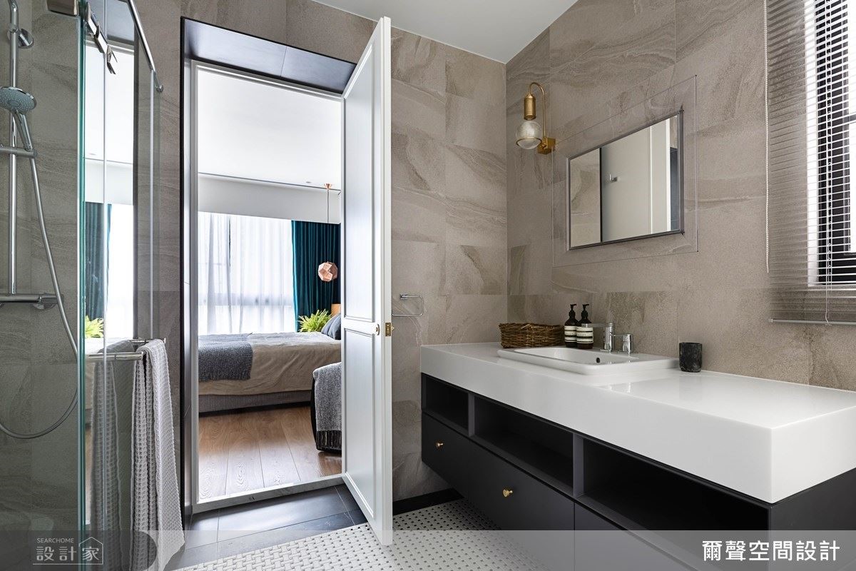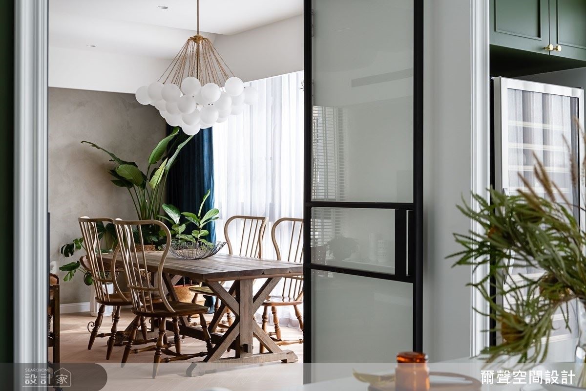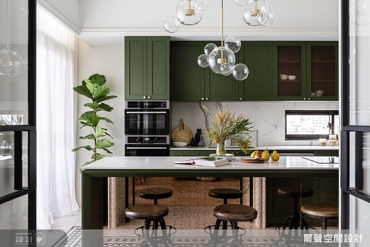 玄關以長廊式規劃,並於通往公領域的門片運用雙開推門設計,營造國外大器感,地坪則藉由地毯磚鋪陳,顯現玄關的重要性,同時也作為動線的引導延伸。客廳電視牆以樂土鋪陳,延伸至整個壁面,透過材質肌理創造立體感受;電視櫃體以浮空設計,並用藍綠兩色,使各空間色彩相互呼應。通往廚房的門延續雙開門設計,搭配現代感語彙呈現,整體空間以英國紳士酒吧為出發,並設立吧檯,湧現一種異國的情調,賦予屋主一處能下廚品酒的天地。主臥以黑中帶藍色彩鋪陳,象徵紳士品味,同時運用個性化燈具妝點,讓睡眠場域散發既沉穩又充滿格調的韻味。