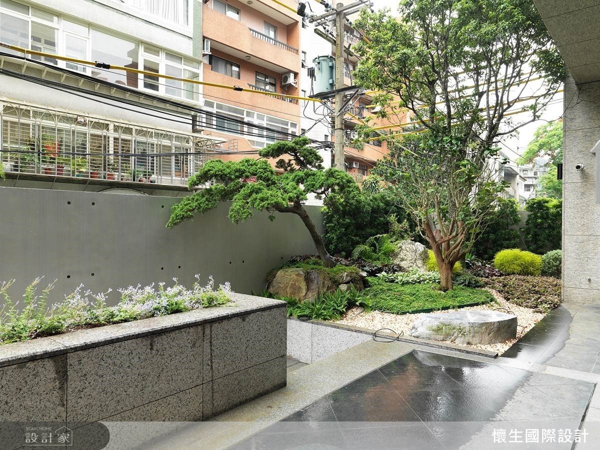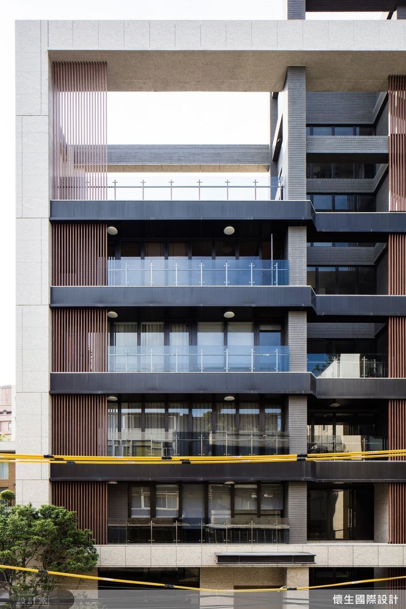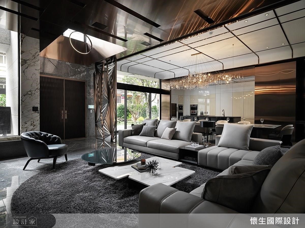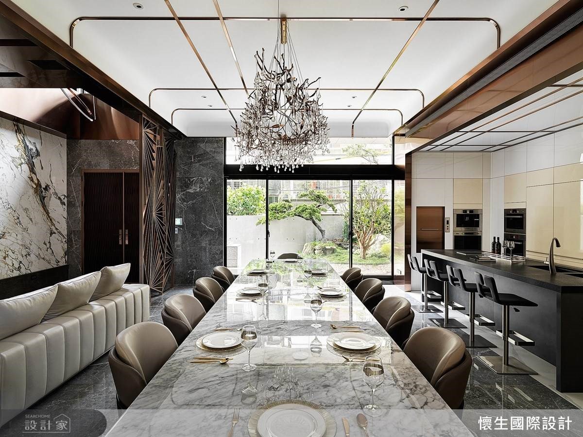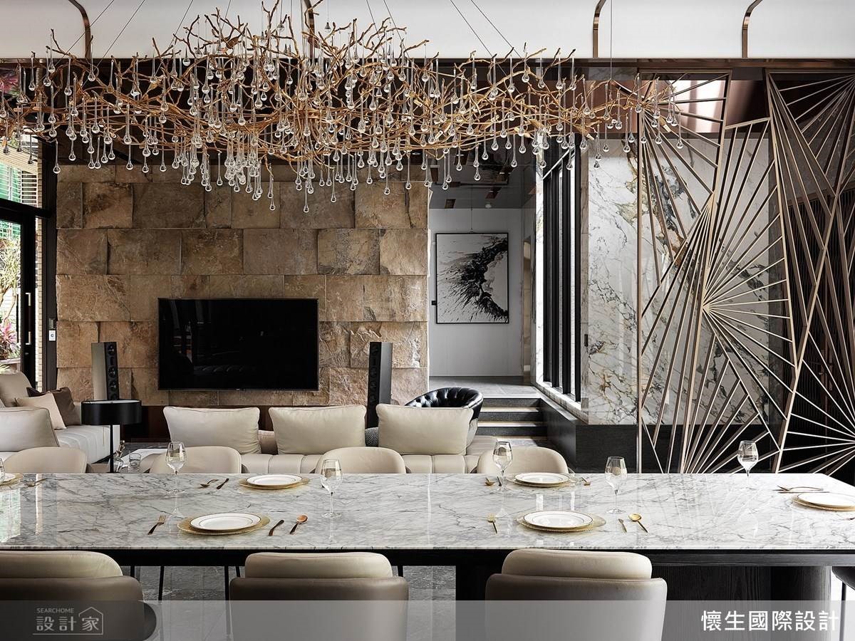 建築外觀融合東方格柵與西式現代建材,不但烘托靜謐沉穩的建築氣質,前庭造景更依照階梯動線,營造生機蓬勃的觀景視角。室內玄關則採挑高設計,搭配精選圓弧吊燈,完美展現屋主雍容氣度。客廳電視牆以粗獷石皮表現精采絕倫的視覺立體層次,一旁宴會廳則依場域訂製容納 20 人的大面餐桌,演繹融藝術、華麗於一體的迷人視覺饗宴。公領域天花精彩選用圓弧造型修飾,搭配金屬線條經緯度分割,細膩織就奢華宴會氛圍。
