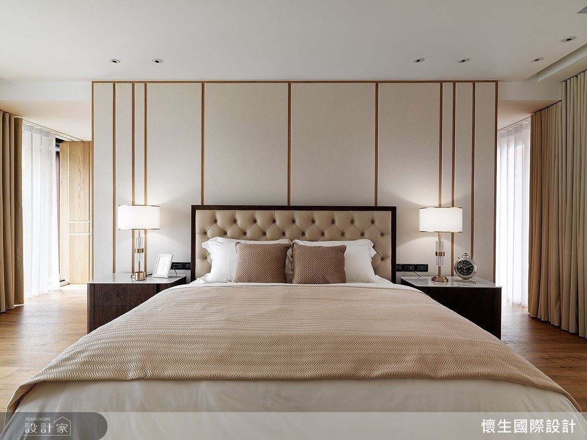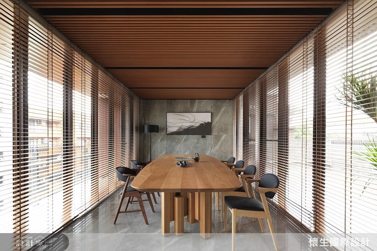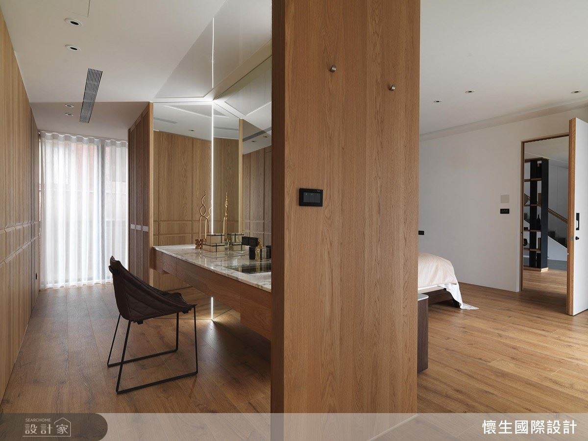 屋主夫妻的休閒室,以格柵天花及木百葉烘托中式情懷,更藉長型訂製木桌匹配空間尺度。主臥套房則以飯店總統套房作整體規劃,利用床頭背牆對側打造大面梳妝區,滿足女屋主造型需求;後方還隱藏貼心茶水櫃,讓愛品茶的屋主夫妻能就近享受睡前喝茶樂趣。