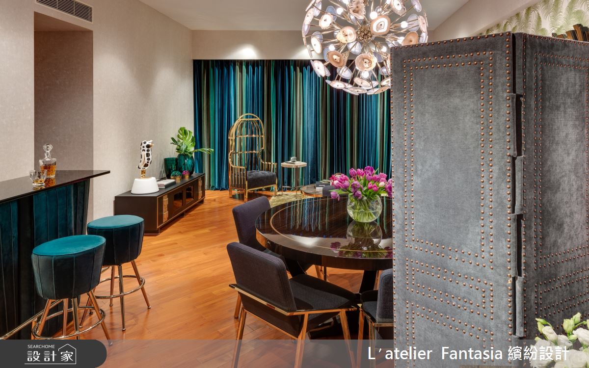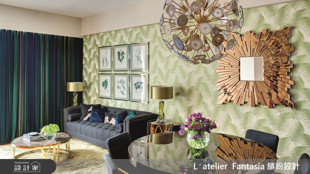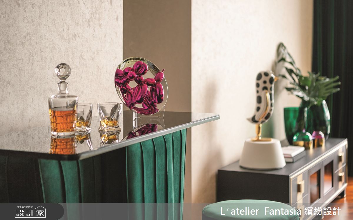 從不同時代的美學風格中汲取創作靈感,新古典、現代、Art Deco及殖民時代的特色兼容並蓄,最終詮釋出品味生活的樣貌。整體公領域以自然感的綠色系為基調,襯上寶石藍、祖母綠、金屬材質,低調展現場域的層次。進門處的玄關區域,以一盞刻意降低高度的吊燈做為整個空間的序曲,傳達沉穩奢華的開端;客、餐廳相鄰,法國進口的頂級絨布窗簾與四時光影巧妙融合,與角落金色線條的主人椅,光澤華美、彼此映襯,餐廳區域則透過精選的瑪瑙藝術燈飾,讓視覺效果更富張力;Jaime Hayon的《神奇動物俱樂部》、Jeff Koons《氣球狗Balloon Dog》等精心挑選的藝術品具有畫龍點睛之效,更含情蘊意,流露家主的品味和生活溫度。