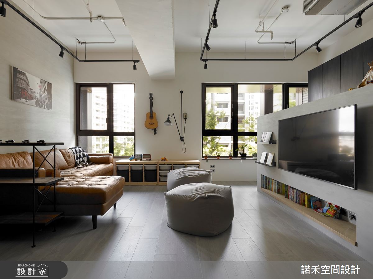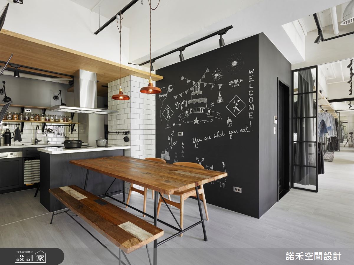 簡單對切型式區分公共區域與私領域,為了讓僅僅13坪左右的開放式客廳區在視覺與機能上更為寬敞,L型沙發靠牆擺放,利用空間深度將電視矮牆稍微前移,預留充足的觀賞距離。客廳功能變多元,可以坐在沙發上看電視,躺在懶骨頭上放鬆閱讀,也可以變成孩子的遊戲空間。與牆面貼齊的收納設計能確保動線不受阻,電視矮牆具備雙面收納的機能,配合底端頂天立地的深色收納櫃將公共區域所需要的大量儲物需求整合在一起。為了讓孩子們能不受限制在牆面盡情作畫,設計師在餐廚區的牆面、兩寢室間的隔牆都以黑板漆作為裝潢材料,在形塑風格同時也用簡單的設計創造更適合孩子的生活空間。